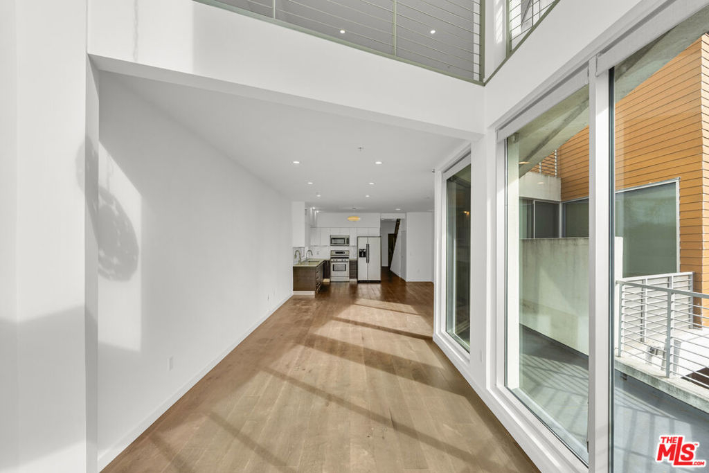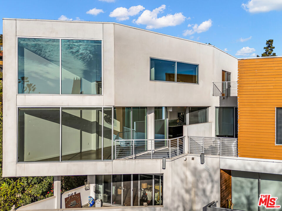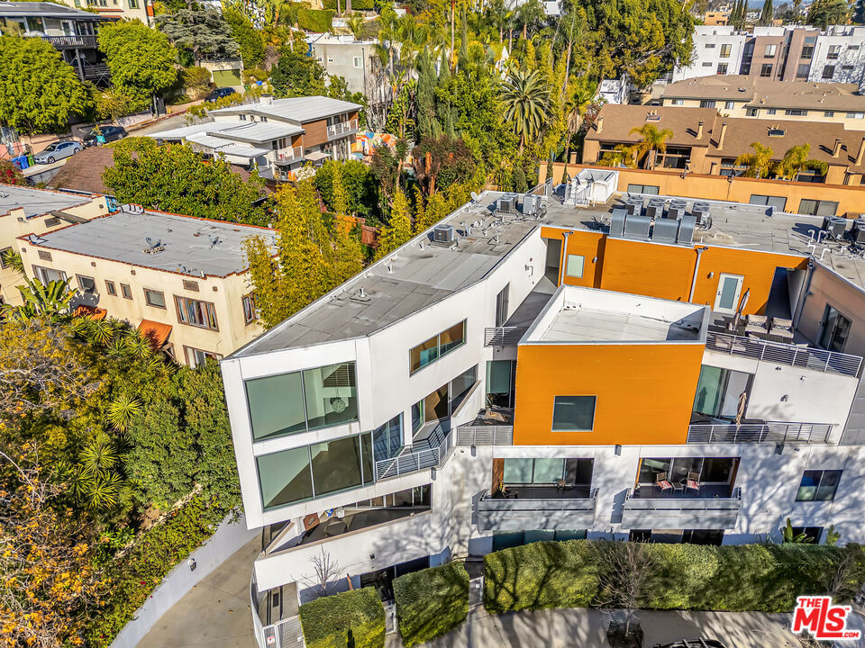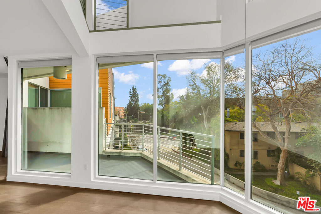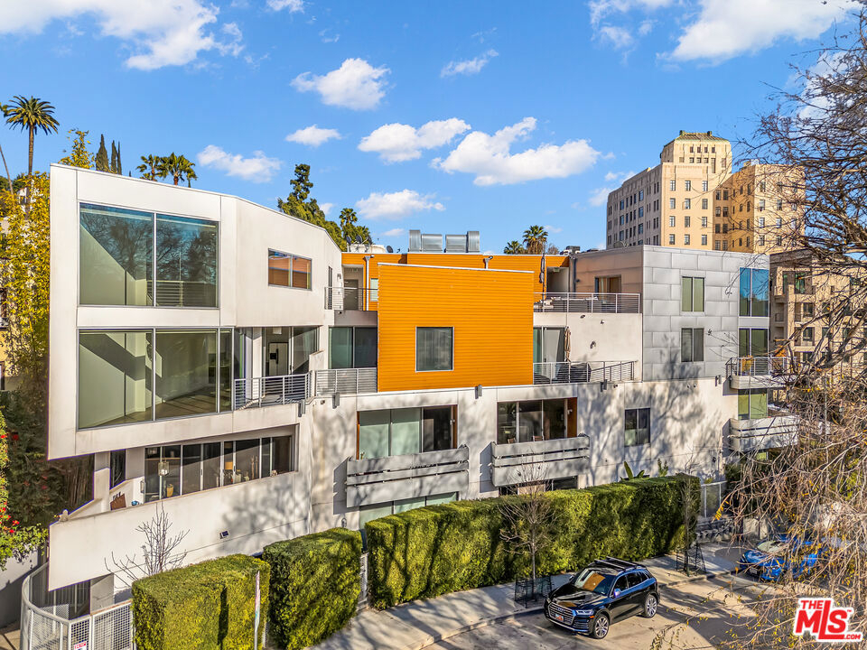 This stunning 2BR/2.5 BA 1,860 sq. ft. Clive Wilkinson, AIA - designed penthouse loft is located in the heart of Hollywood at 6683 Franklin Ave. in one of the most architecturally exclusive buildings in Los Angeles. This building's 2008 provenance marked Wilkinson's first residental loft design in Los Angeles. The cinematic two-story penthouse is the most highly desired end-unit of the building on quiet Las Palmas. It features dual-paned, floor-to-ceiling windows creating dramatic volume while including broad views of the city lights of Hollywood. Located in a small nine-unit building, this unit has two large interior living spaces both upstairs and downstairs along with private outdoor spaces for entertaining. Upstairs, the primary suite includes a modern, versatile design including an office with built-ins. Kitchen has an open layout and includes imported Italian cabinetry with soft-close drawers, quartz counter-tops, and all-stainless steel appliances. Stylish wide-plank hardwood flooring throughout. In-unit side-by-side laundry and tankless hot water heater. Enjoy evening toasts to Hollywood on two spacious outdoor lounge areas with city light views on each level of the loft. The gated community garage includes two-car assigned side-by-side parking spaces with secured, spacious steel storage units and four visitor parking spaces. HOAs are $665 per month. Located just steps from the Hollywood Bowl and all the nightlife and dining of Hollywood, yet this loft is its own peaceful and quiet urban retreat.