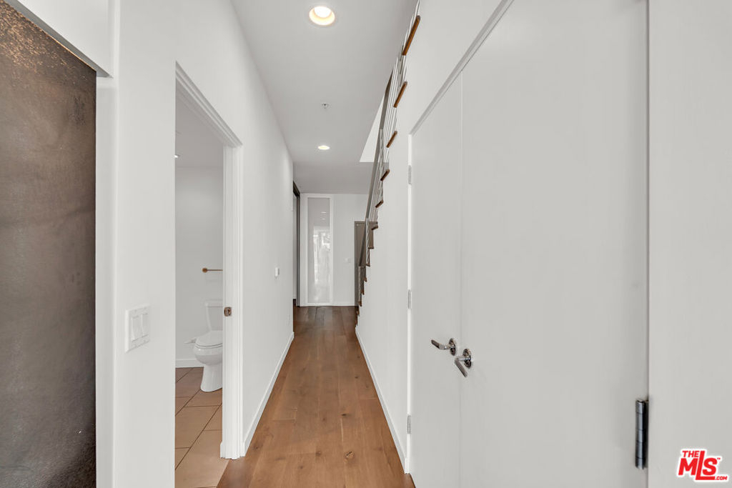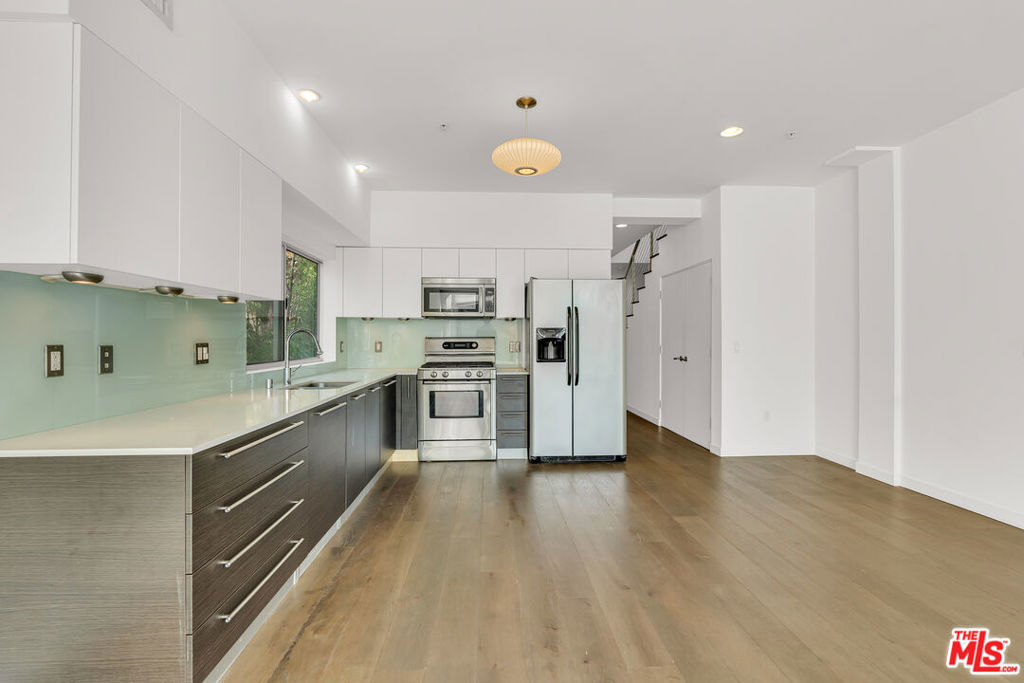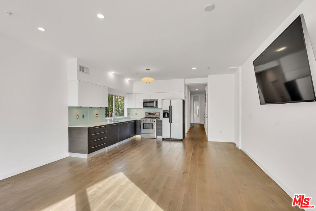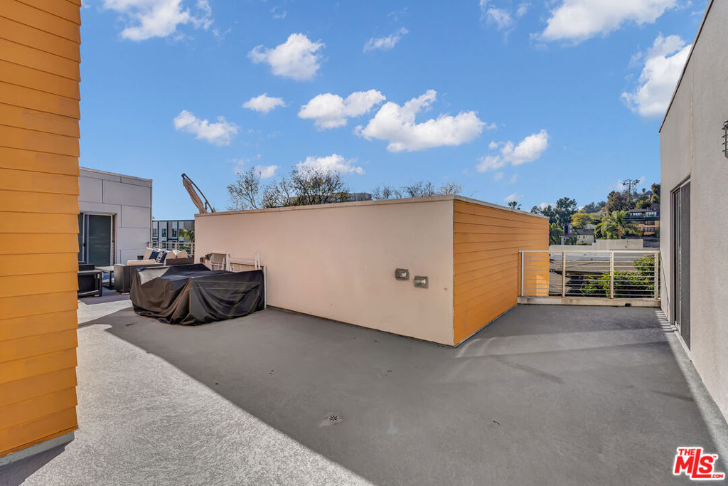 This stunning 2BR/2.5 BA 1,860 sq. ft. Clive Wilkinson, AIA - designed penthouse loft is located in the heart of Hollywood at 6683 Franklin Ave. in one of the most architecturally exclusive buildings in Los Angeles. This building's 2008 provenance marked Wilkinson's first residental loft design in Los Angeles. The cinematic two-story penthouse is the most highly desired end-unit of the building on quiet Las Palmas. It features dual-paned, floor-to-ceiling windows creating dramatic volume while including broad views of the city lights of Hollywood. Located in a small nine-unit building, this unit has two large interior living spaces both upstairs and downstairs along with private outdoor spaces for entertaining. Upstairs, the primary suite includes a modern, versatile design including an office with built-ins. Kitchen has an open layout and includes imported Italian cabinetry with soft-close drawers, quartz counter-tops, and all-stainless steel appliances. Stylish wide-plank hardwood flooring throughout. In-unit side-by-side laundry and tankless hot water heater. Enjoy evening toasts to Hollywood on two spacious outdoor lounge areas with city light views on each level of the loft. The gated community garage includes two-car assigned side-by-side parking spaces with secured, spacious steel storage units and four visitor parking spaces. HOAs are $665 per month. Located just steps from the Hollywood Bowl and all the nightlife and dining of Hollywood, yet this loft is its own peaceful and quiet urban retreat.