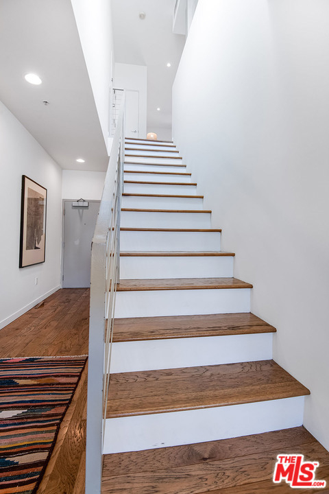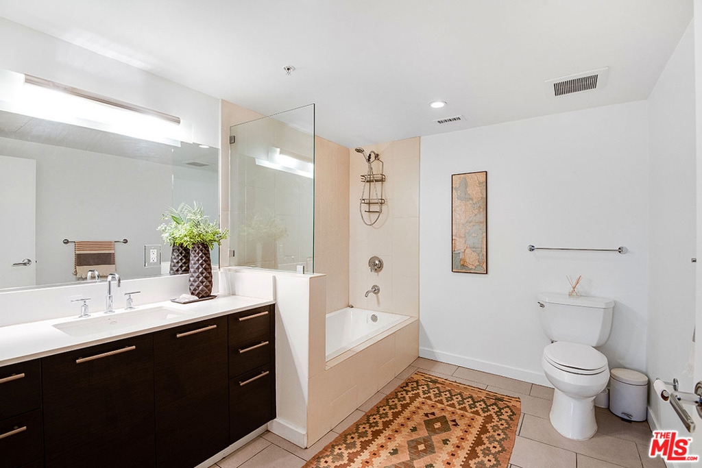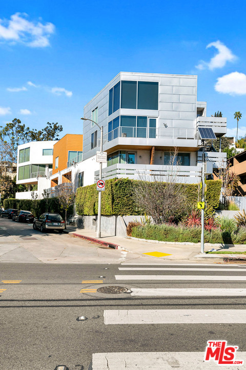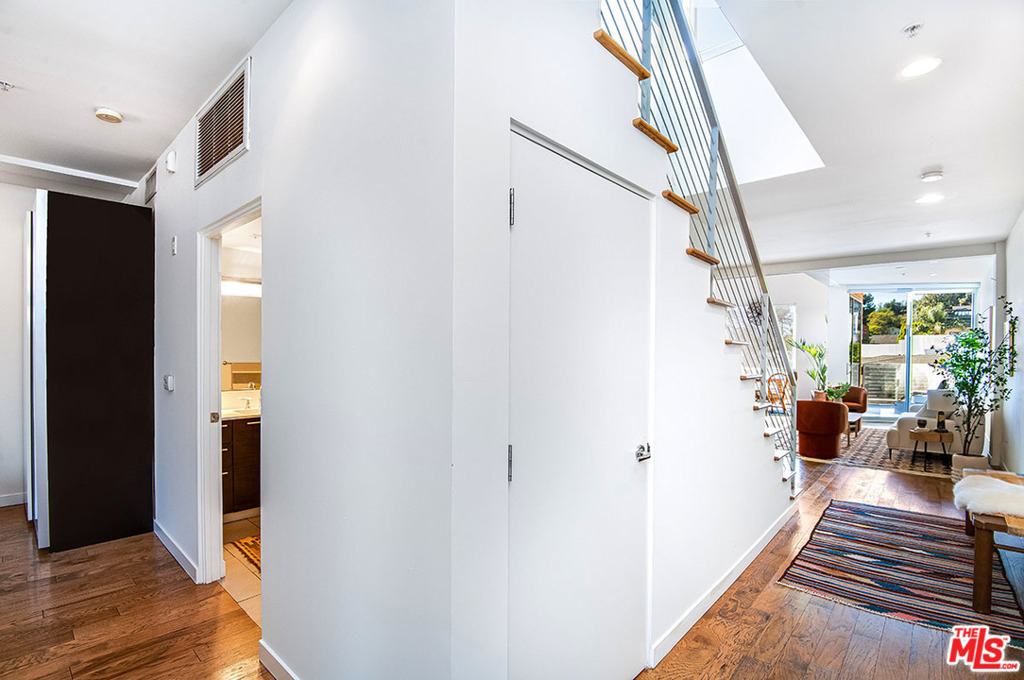 Dramatic Loft-Style residence with tree top views in Hollywood. "10 Palms" is a nine unit architectural building in the historic district of Whitley Heights and designed by Clive Wilkinson AIA. This open two-story floor-plan features 1 bedroom, 2 bath plus a flexible BONUS ROOM, full-length glass apertures, a private balcony, "green" cabinetry by Doimo Cucine, Caesar stone counter tops, stainless steel appliances, wide plank hardwood floors and in unit washer/dryer. The 2nd level includes the master bedroom with en-suite bathroom and access to an additional patio (semi-private). There is secure gated street access and 2-car side by side parking in the subterranean garage that includes guest parking and extra storage. Close to Hollywood bowl as well as Hollywood & Highland Metro Station. Must see!!!