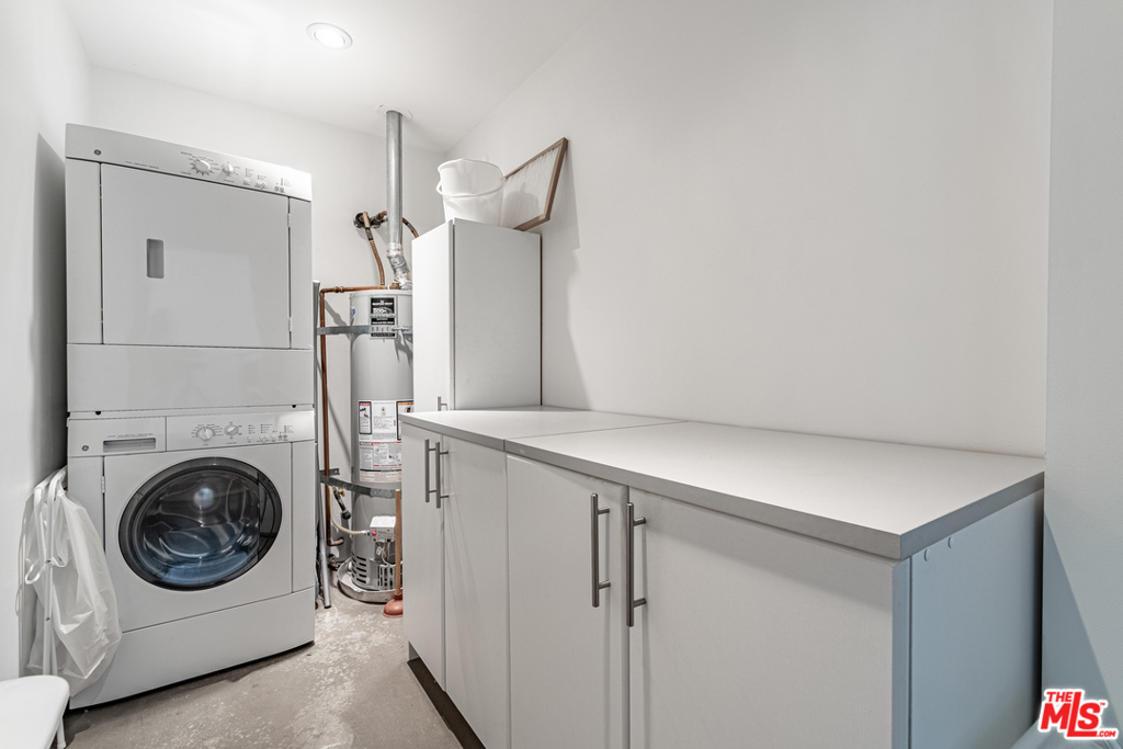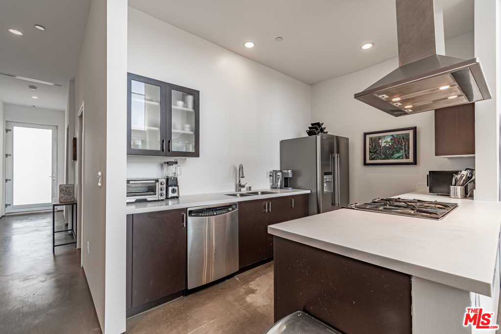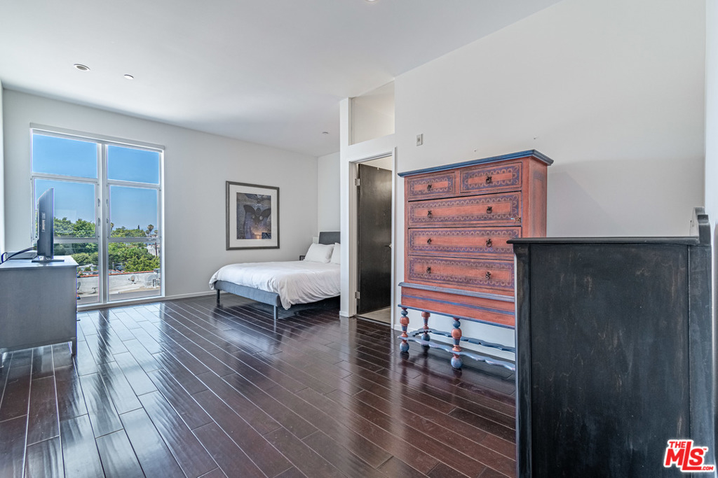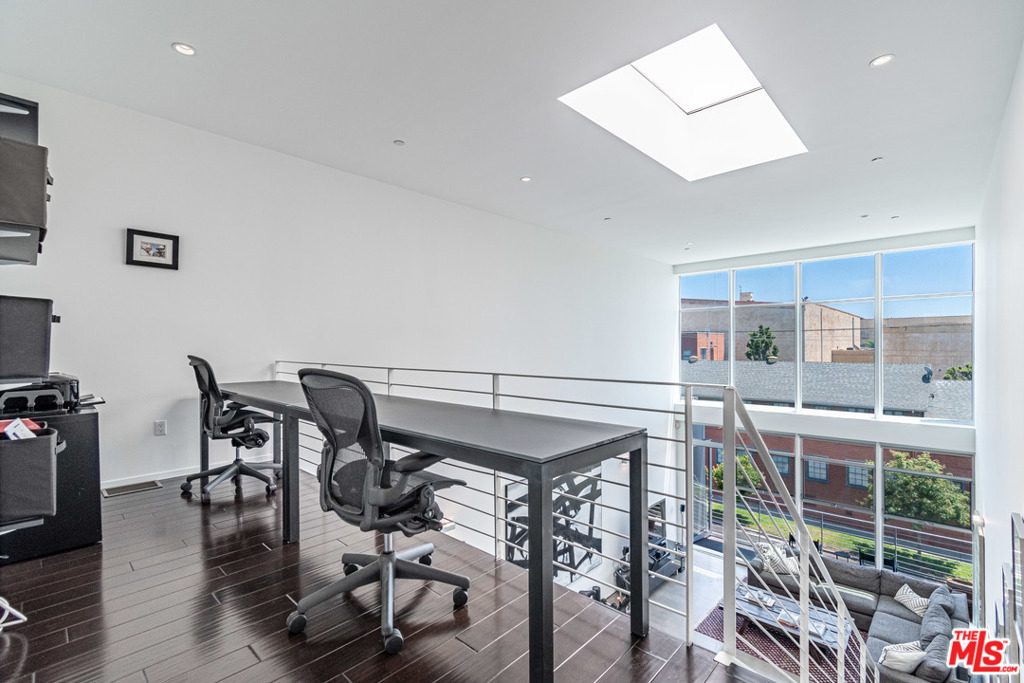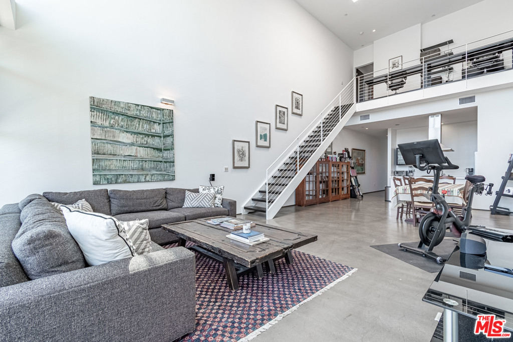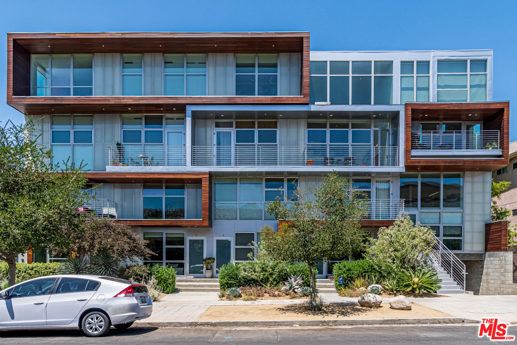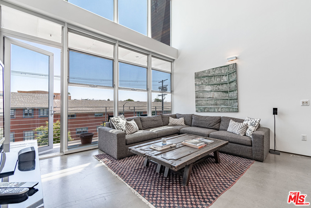 Dramatic 2 story top floor penthouse in award winning architect Lorcan O'Herlihy's inspiring 10 unit complex located just blocks from Larchmont Village. This light filled unit features 18 foot ceilings, walls of windows and expansive walls for artwork. The main level features concrete floors, open kitchen with quality appliances, open and airy living and dining spaces that opens out to a private balcony, guest bedroom with private bath and a laundry room. Climb the architectural staircase and find an office area with views plus a large owners suite with additional views to the west. Secure parking for 2 cars. Well run complex with low homeowner dues and a rare find in this price point.