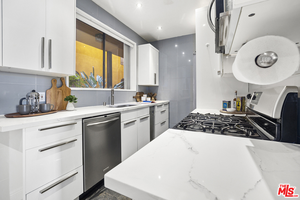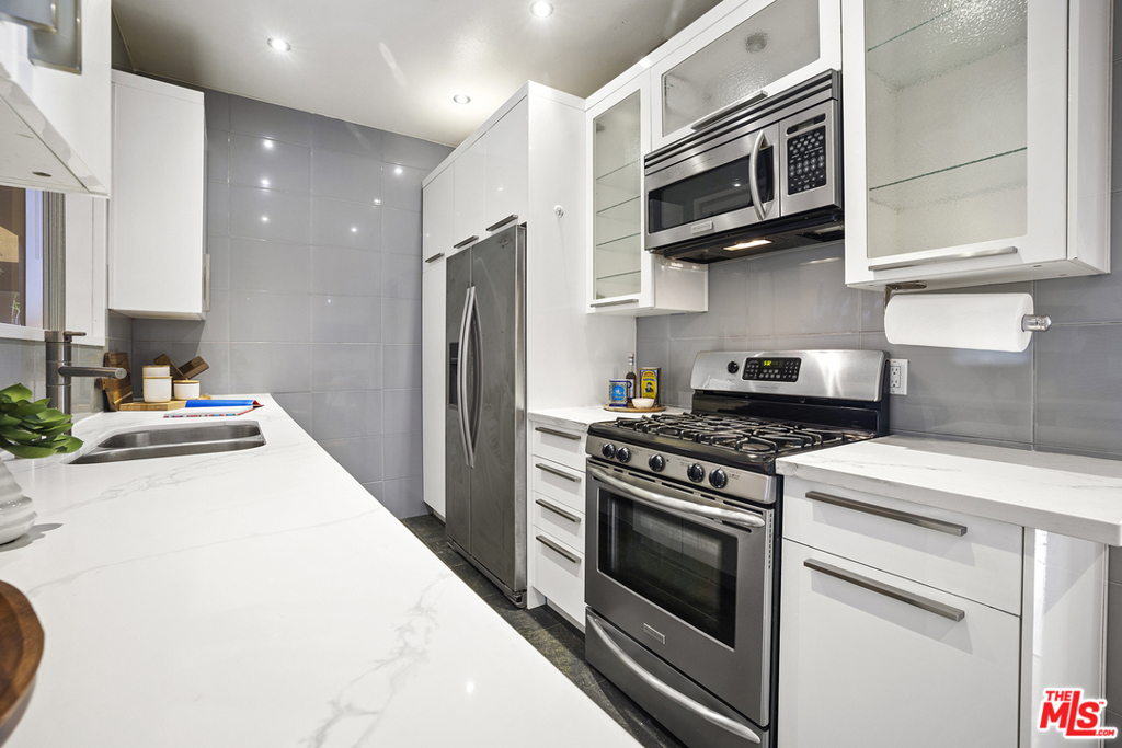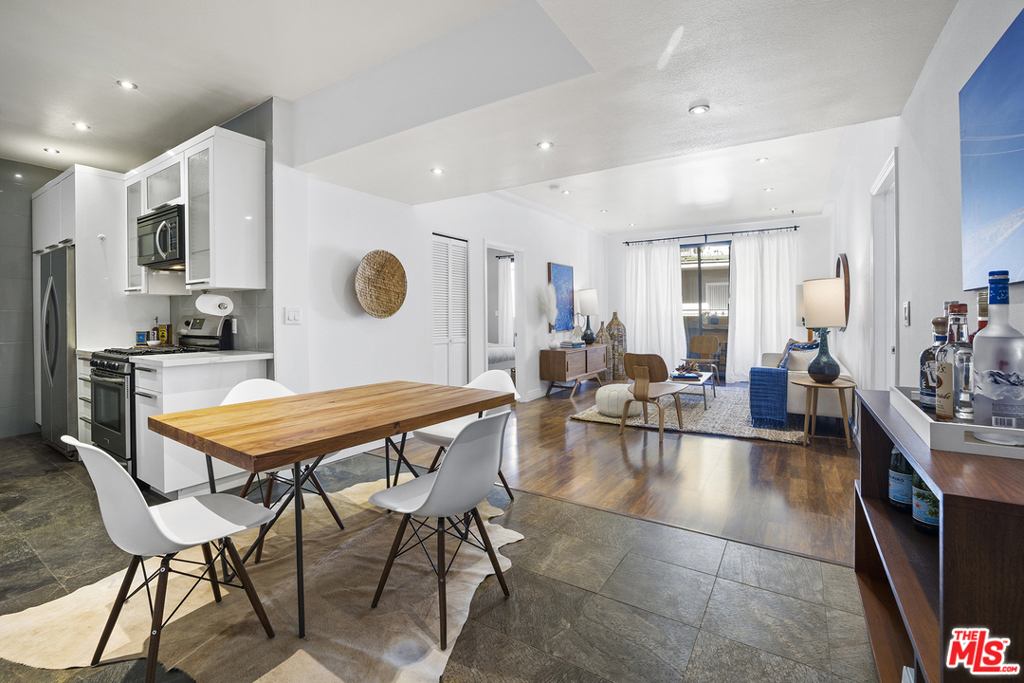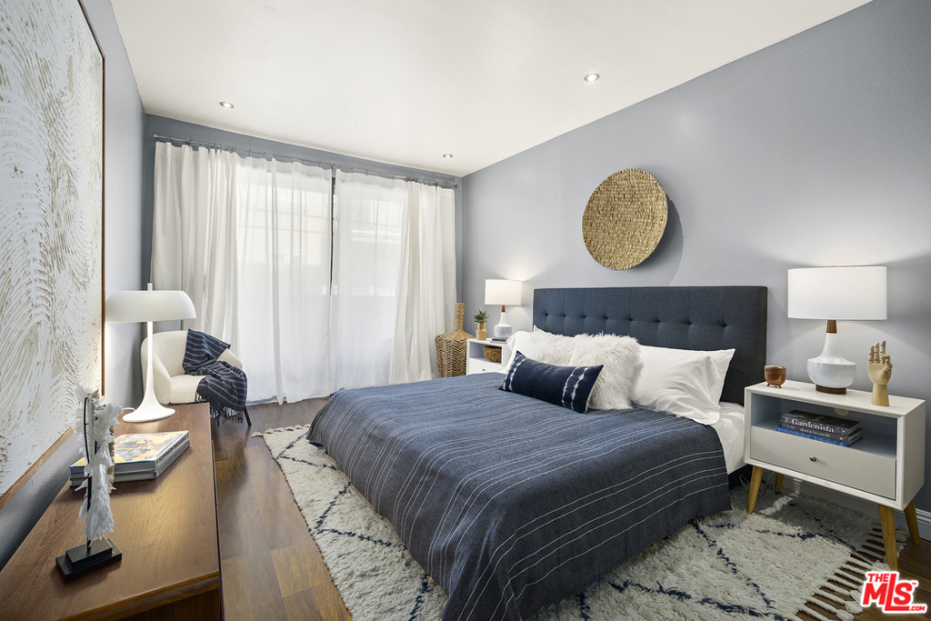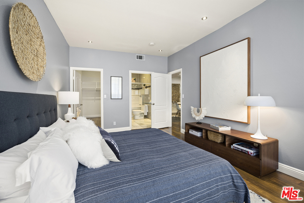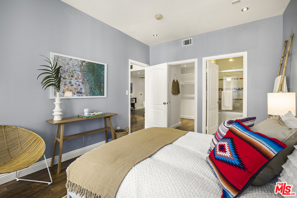 Completely upgraded Smart condo situated in the heart of Hollywood's Media District. Features include recessed lighting, central air + heat, oversized balcony and dual main bedroom suites with HUGE walk-in closets. The updated kitchen includes brand new quartz counters, custom cabinetry w/ accent lighting & stainless steel appliances. Additional bonuses include a Nest thermostat, Smart lighting (compatible w/ Alexa/Google/Apple), new AC condenser and two side-by-side parking spaces. Well-maintained Spanish style building with guest parking, low HOA dues (which include EQ insurance) and Hollywood Hills views from the building's furnished rooftop deck. Centrally located in one of Hollywood's most desirable neighborhoods just minutes away from numerous restaurants, nightlife and shopping options.