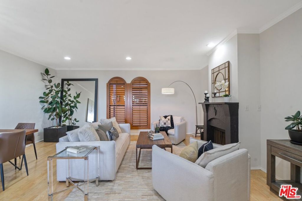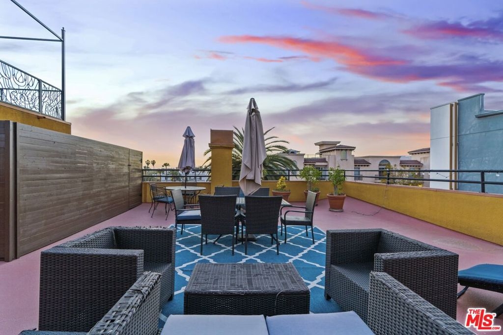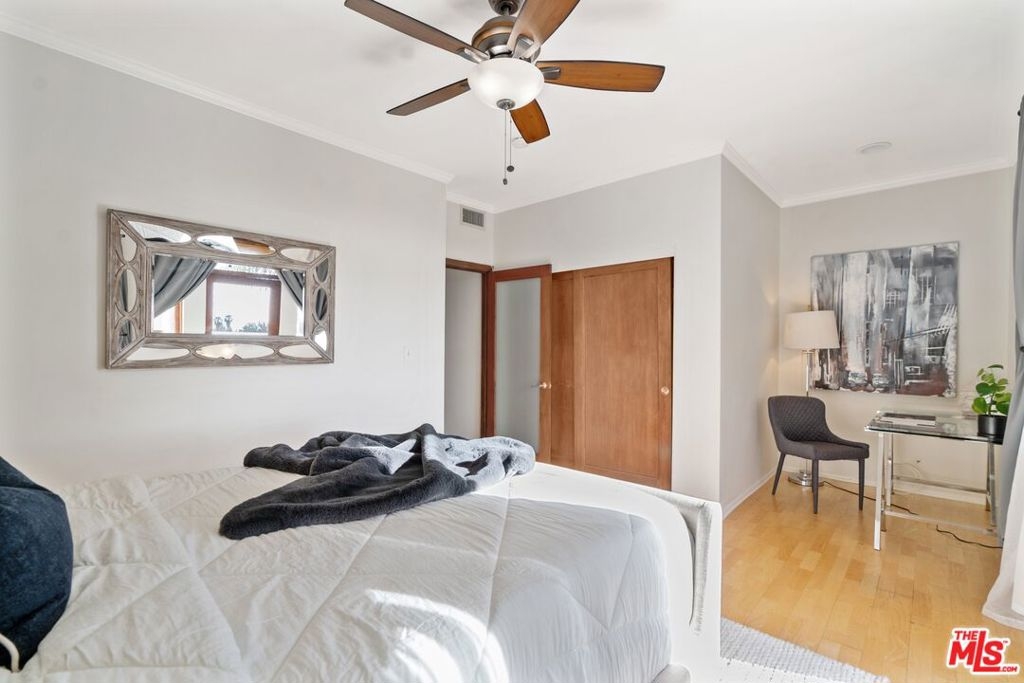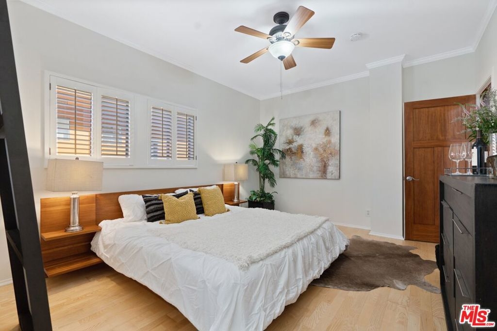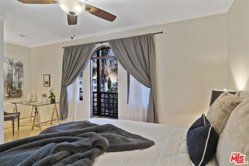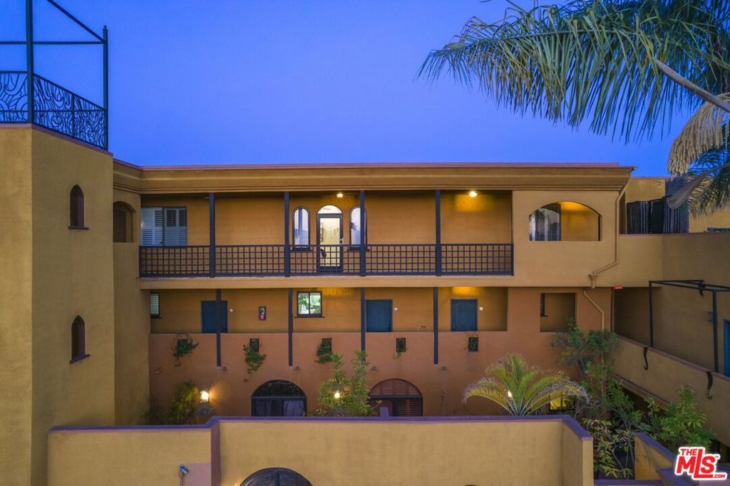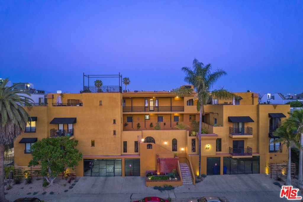 West facing, top floor 2 bed/2 bath condo is situated in a beautiful, 25-unit contemporary Mediterranean complex with a serene courtyard, in the heart of Hollywood's Media District. Revel in the welcoming living area featuring an open living, dining and kitchen floor plan. High ceilings and natural light highlight the overall grandeur of the space. Beautiful hardwood floors extend throughout, and the open kitchen features stainless steel appliances with ample storage and counter top space. Upstairs, take refuge in the primary bedroom with its updated en suite bathroom, large walk-in shower with body jets, as well as a custom walk-in closet by California Closet to fit all your fashion needs. The light-filled, spacious 2nd bedroom has a bonus space that can flex as a workout or office nook. This second bedroom opens out to a wrap-around shared balcony so you can start the day off with that crisp morning air and then wind down from the day with a mesmerizing, calming sunset. The 2nd bedroom leads out to the shared rooftop patio with shared BBQ, which offers a perfect spot to entertain friends, lay out in the sun and hang out under the lights during our seemingly-year-round warm LA nights. Centrally-located amongst the diverse fabric of LA's neighborhoods, enjoy the calm, quaint well-manicured Larchmont Village and Hancock Park to the south; the nightlife and dining in Hollywood to the north; the eclectic vibe of Melrose, Fairfax, and West Hollywood to the west; and the variety of entertainment and dining options in DTLA to the east. Enjoy the convenience of great shopping and boutique stores along Melrose at the Grove and in Larchmont Village, museums & art exhibits, and awesome concert venues & theaters all within just a few miles. HOA dues include water, sewer, trash and EQ insurance. 2 SIDE-by-SIDE parking spaces complete this unit. Per HOA, W/D in-unit is allowed with architectural committee's approval of plans and pending any city permitting requirements. Buyer to investigate.
