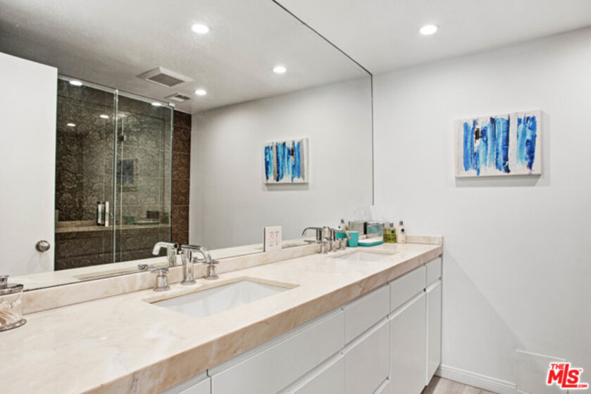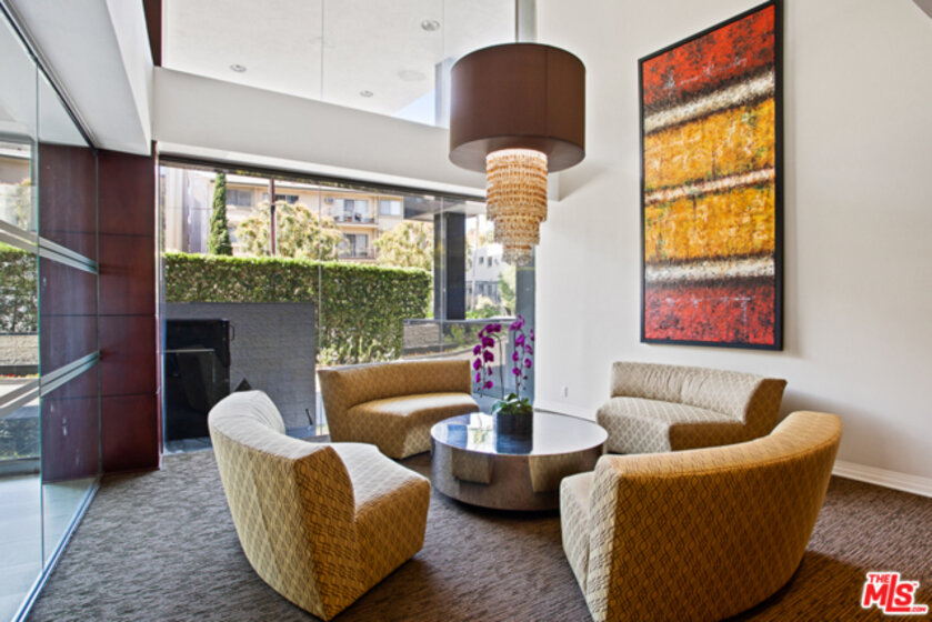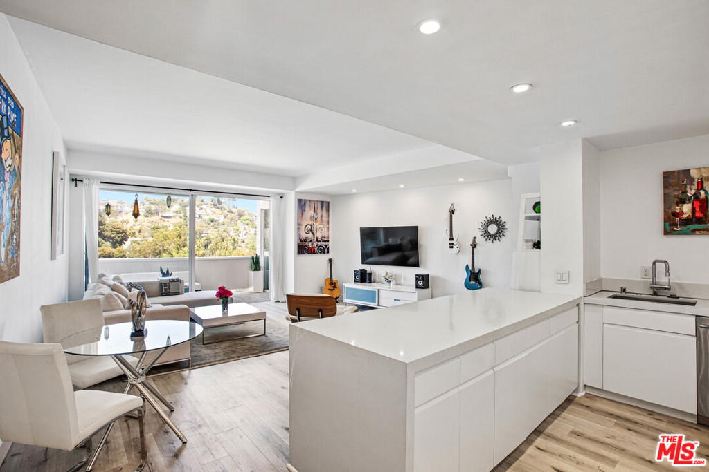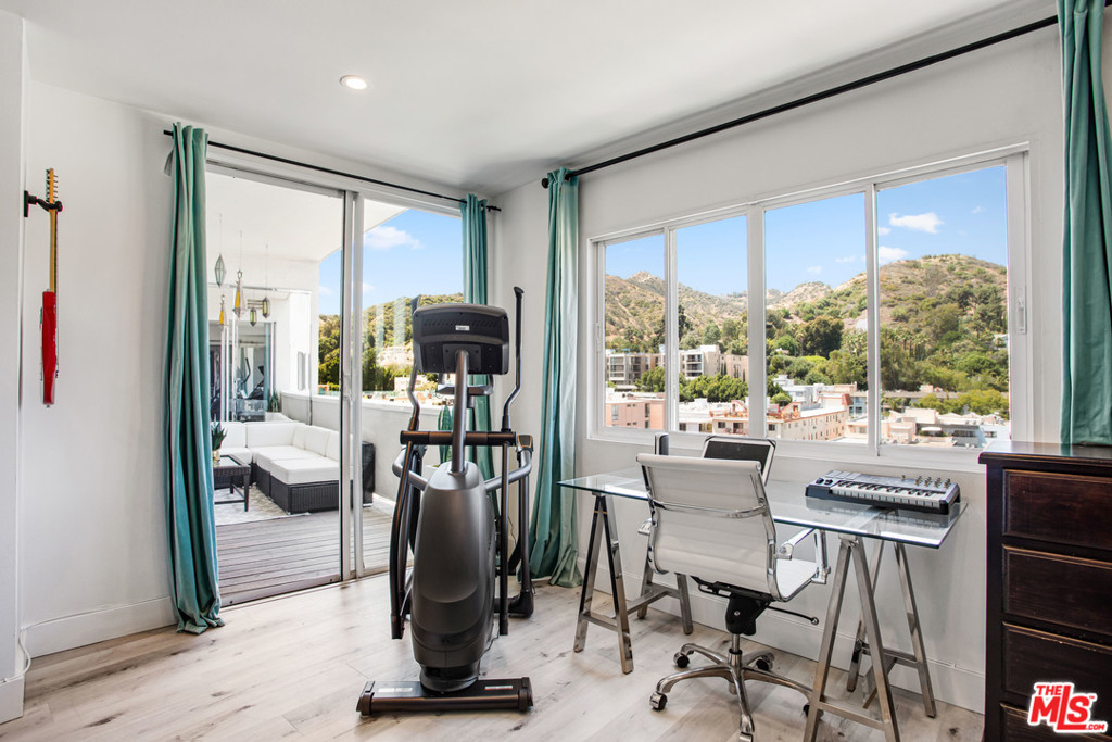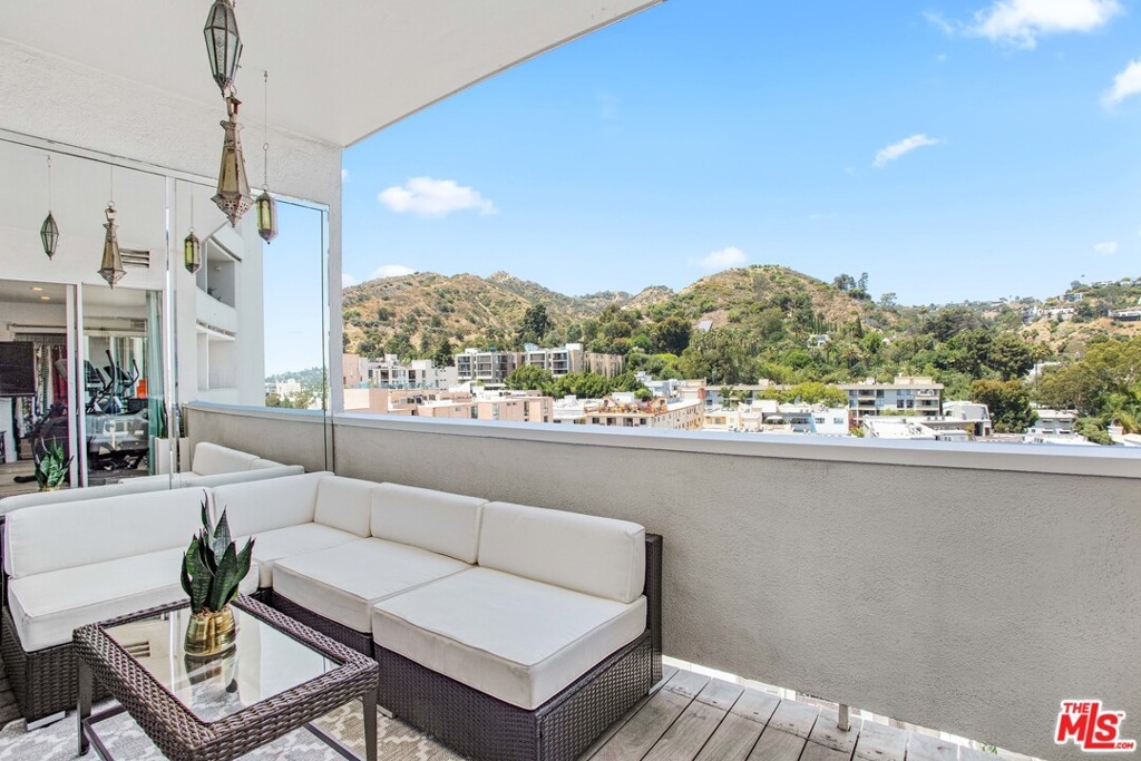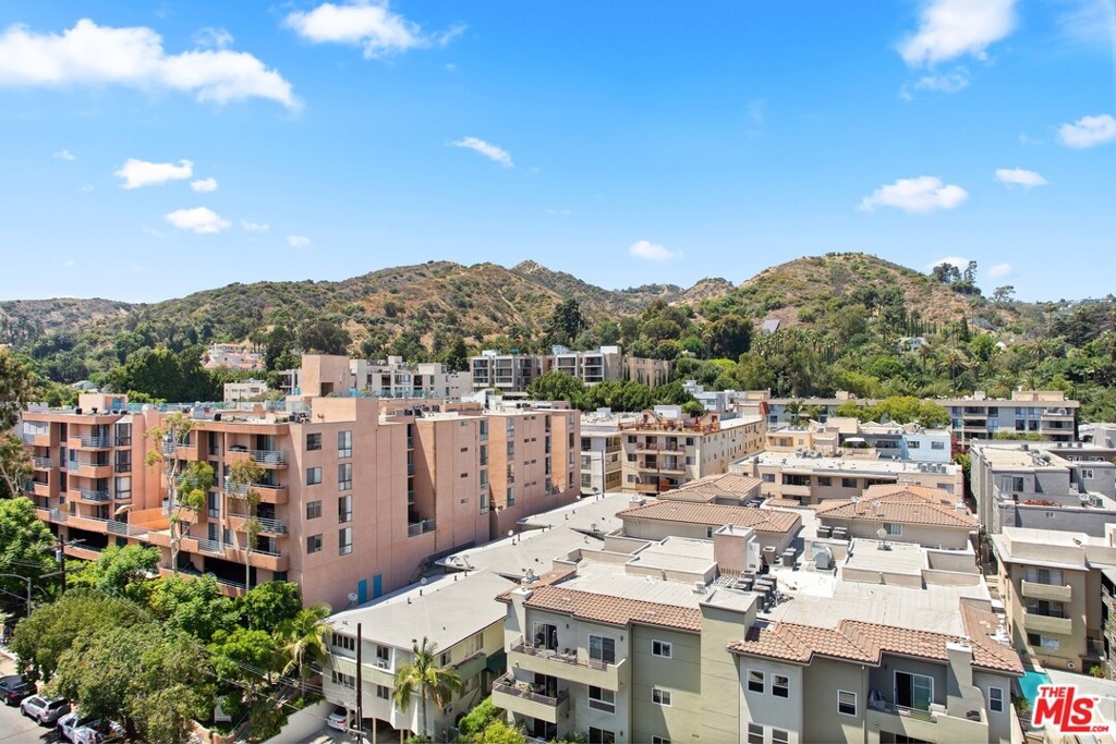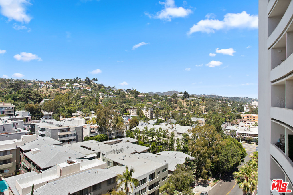 Elevated living creates commanding views of the Hollywood Hills in this spacious, sought after floor plan featuring seamless transitions, crisp lines, modern updates & standout sunsets. Ideal for entertaining, floor to ceiling glass sliders, large balcony, all day consistent northern light. High ceilings, recessed lights, hard surface flooring brings forward modern updates, waterfall kitchen island, bar seating, ample finger rail cabinetry storage, stainless steel range hood, oven & DW. Guest bathroom, custom sink vanity, tile surround, hallway in-unit Bosch stackable laundry.Oversized master suite, loft-like exposed closets, add'l living/office/flex space, en-suite bathroom, custom double vanity, enclosed glass rain shower w/ hand wand.Full service amenities: 2 car tandem parking spaces, XL storage, refined lobby, updated hallways, valet guest parking, security, concierge, pool/spa, clubhouse, rooftop sundeck, yoga room & gym all w/ comparatively low HOA dues.
