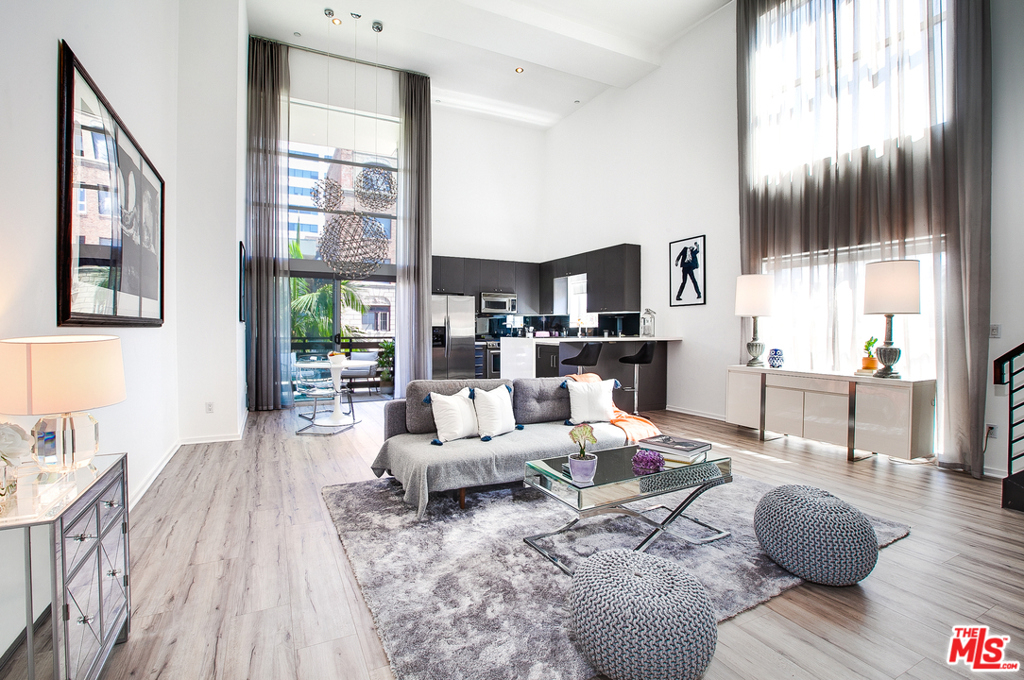 This impressive loft-like home features dramatic 18' ceilings, a spacious two-level floor plan and a private balcony which allows for an abundance of natural light. This front-facing, newly renovated unit includes wood flooring, oversized windows, wine fridge, stainless steel appliances, marble countertops, updated bath and modern fixtures throughout. Amenities include central AC and heat, in-unit washer & dryer, two gated and secure parking spots, ample guest parking, a low HOA and a community rooftop deck with panoramic views of the city. Located around the corner from the iconic Roosevelt Hotel, you'll enjoy the easy convenience of restaurants, shops, theaters, nightlife, parks and so much more!