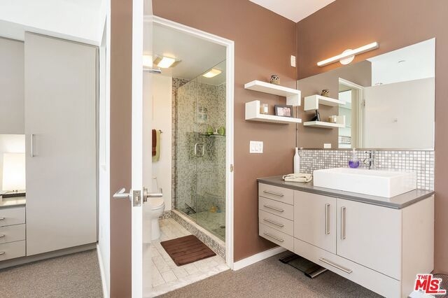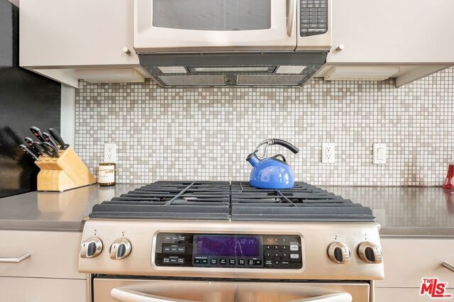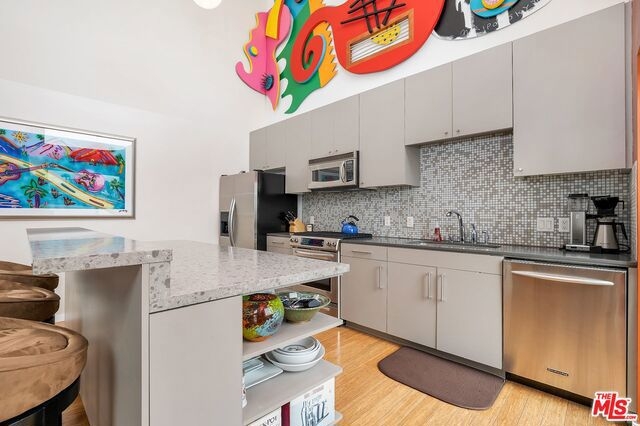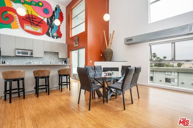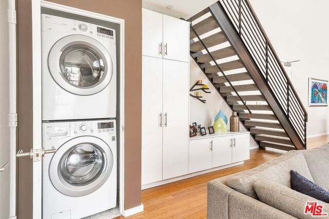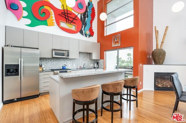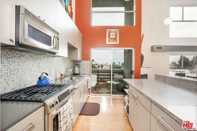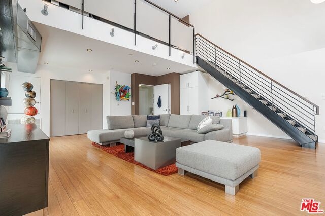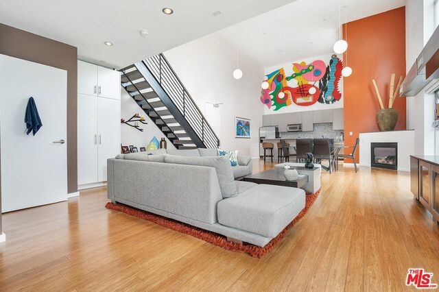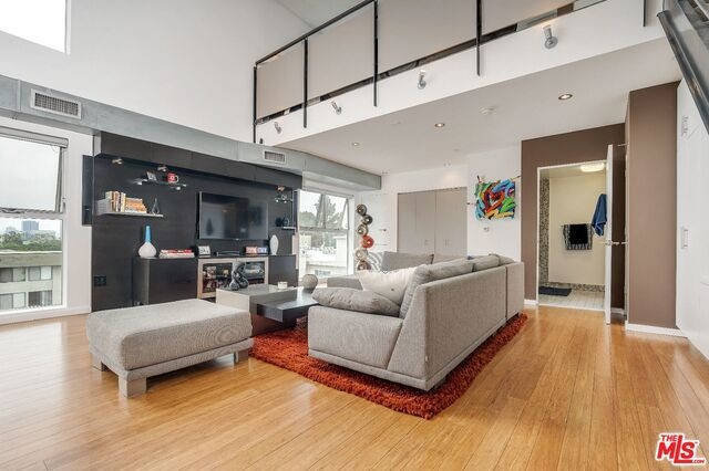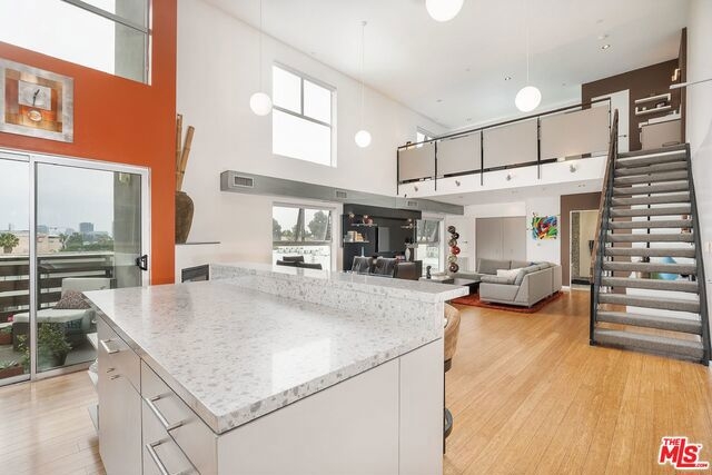 This dramatic 2 story architectural loft features 18' ceilings, a spacious open floor plan & walls of glass to views of the Hollywood sign & city lights. Light filled top floor unit in a building that's ideally located close to Runyon Canyon & all that Hollywood has to offer. Currently configured as a one bedroom, the 2nd bedroom is open to living room but can be walled off as has been done in similar units. The Master bedroom is the loft overlooking living room. The main living area features an amazing open kitchen w/ Caesar stone counter tops, s/s appliances, center island w/breakfast bar. There's a terrace, fireplace, bamboo floors & a full bath w/marble floors, Caesar stone counters & tiled back splash. The spacious 2nd floor master level affords a view to the city as well as to the living area below. It has custom closets & an in-suite marble/Caesar stone bath. This one owner, squeaky clean loft also features an in-unit washer/dryer, 2 side by side spaces & ample quest parking.