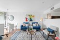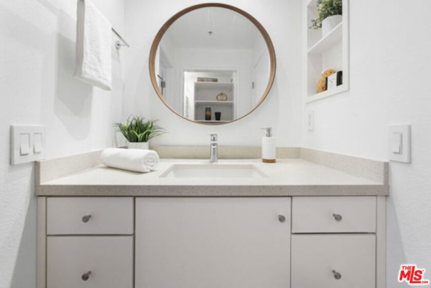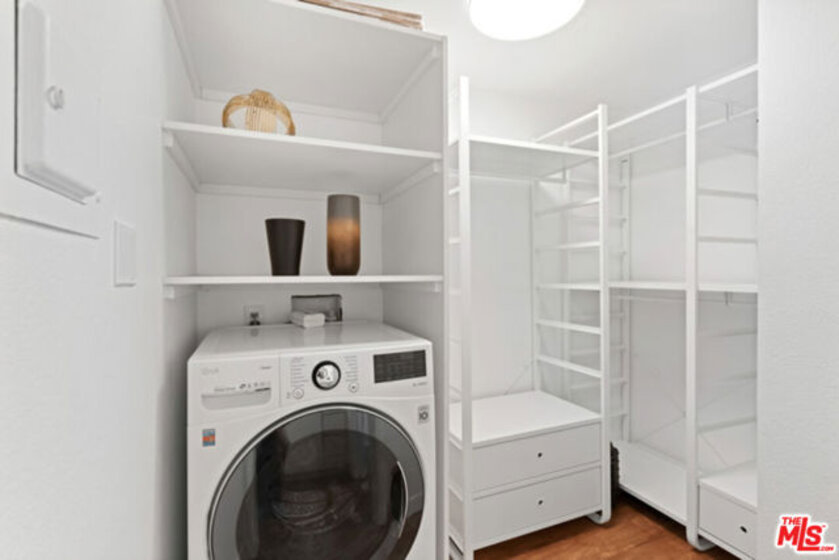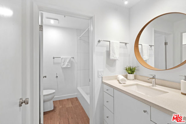 Classy and Fully updated sleek Condo in Hollywood! Perfectly located in the heart of Hollywood/Sunset Strip at the Hollywood Regis building, this FULLY RENOVATED JNR/1BA home is fully equipped for easy and comfortable living. Step inside to find an open floor plan with premium finishes, fabulous natural light, stunning hardwood floors, a designer color scheme, and a spacious living room. Entertain guests and mix drinks in the open concept kitchen featuring quartz countertops, stainless-steel appliances, dishwasher, sleek ample white cabinetry, gas cook-top, built-in microwave, track lighting, and an adjacent dining room with double glass soundproof sliding glass doors to the spacious balcony. Sit on the balcony and sip cocktails with friends while admiring the fabulous views of downtown Los Angeles. Discover relaxing evenings in the NYC loft style bedroom, which has a large walk-in closet with your own washer and dryer, Separate bathroom w/storage vanity and a shower/tub combo and separate vanity area. For a fit lifestyle, enjoy the community amenities of a sparkling heated swimming pool, hot tub, sun deck w/cabanas, and a fitness ceneter! Other features: 1-covered and secured parking space, onsite management, security fob on all entries, close to Runyon Canyon, shopping, chic restaurants, the Hollywood Bowl and more! Easy living LA style, the perfect pied- a -terre, first home or LA city pad, this little gem is a must see!