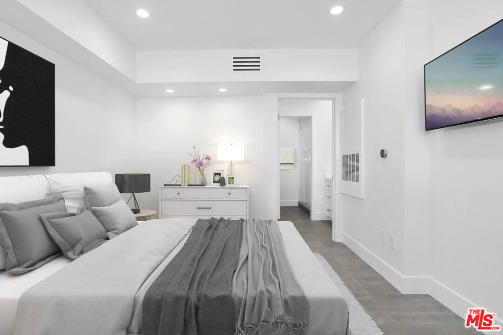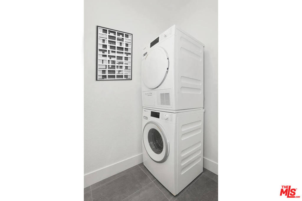 Striking modern top-floor unit with brand-new high-quality finishes. Italian porcelain tile floors and crisp white walls paired with recessed lighting present a welcoming ambiance you'll want to linger in. A large living room opens to the kitchen and dining area which features a dazzling fireplace on a tiled wall. In the Kitchen, Quartz countertops and stainless-steel fixtures complement the high-end appliances, while a double-insulated sliding glass door leads to a balcony that overlooks the iconic downtown LA skyline - making it the perfect spot for your morning coffee. This easy-care floor plan offers a private bedroom area plus an elegantly stylish hotel-inspired bathroom that features a glass-enclosed shower, plenty of countertop space, and a bidet toilet. A stackable washer-dryer and a walk-in closet finish off all this jewel in the sky has to offer! Conveniently located in the heart of Hollywood, the building provides a pool & spa, a fitness center & secured parking. HOA includes water, trash and maintenance.