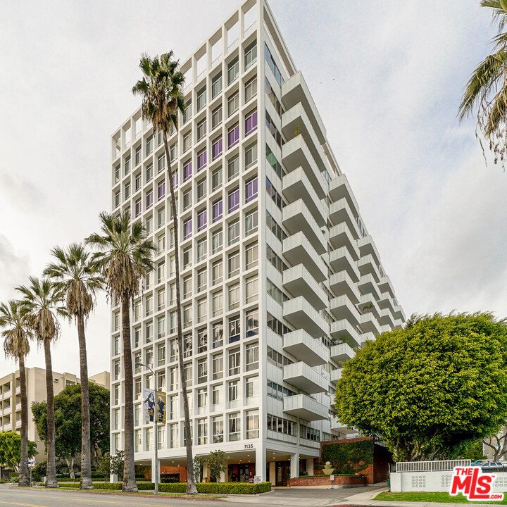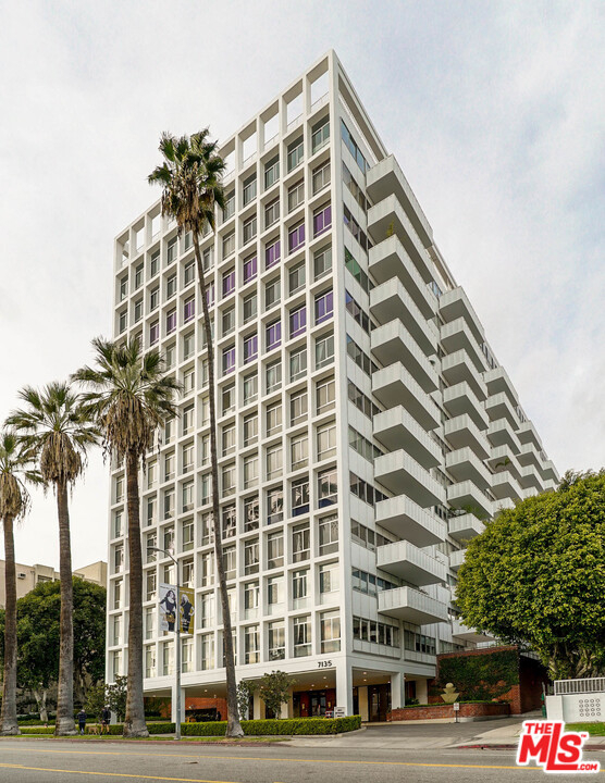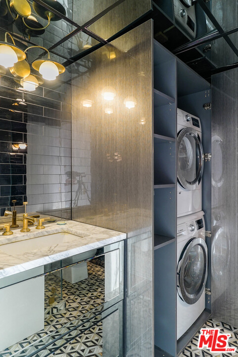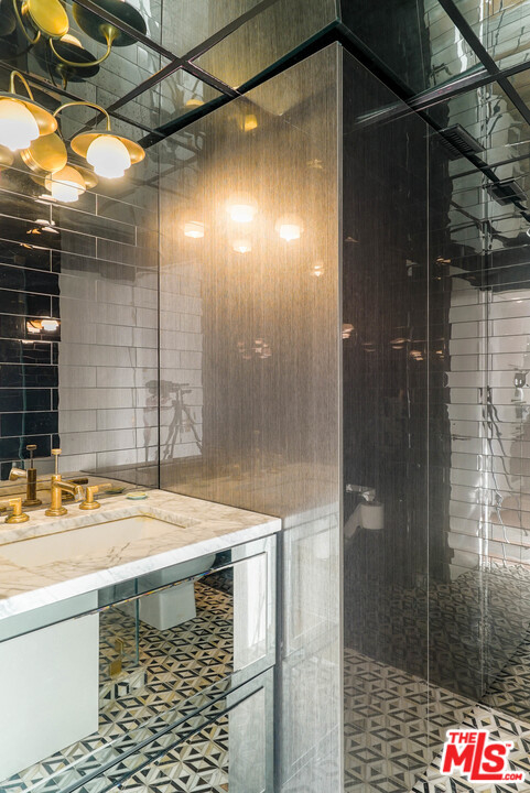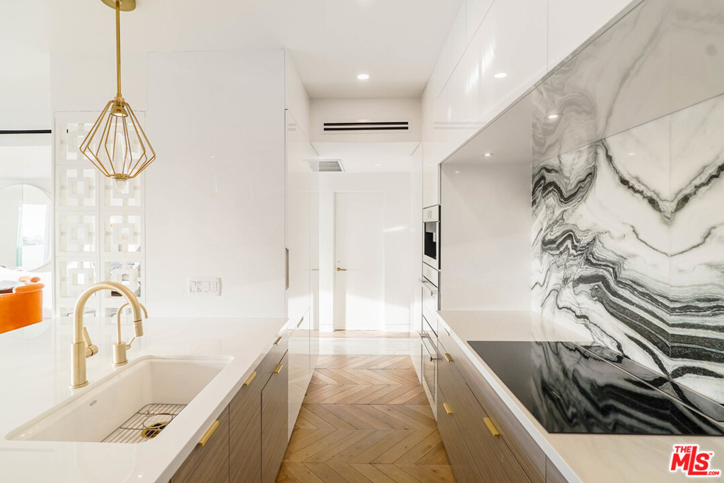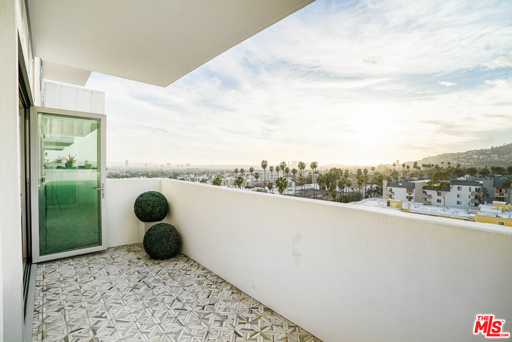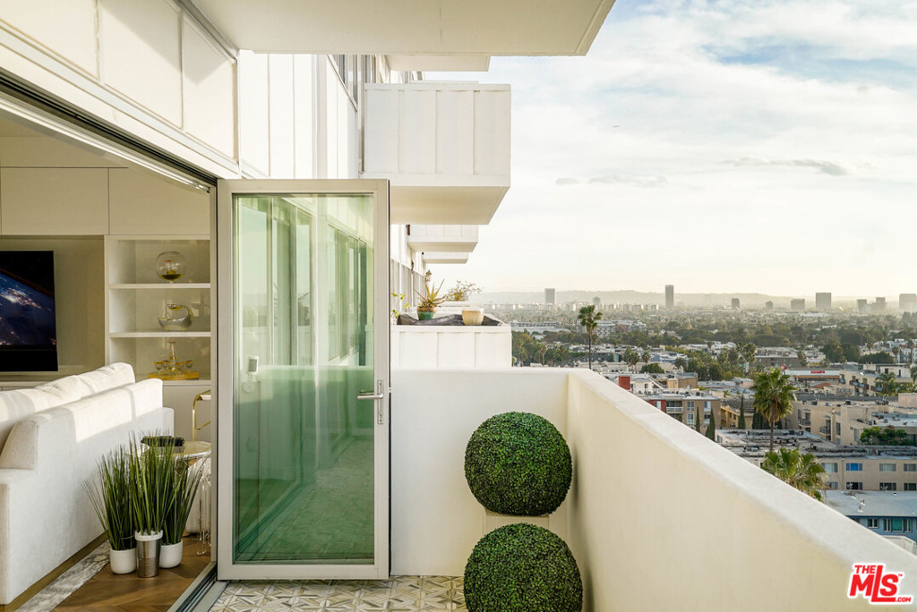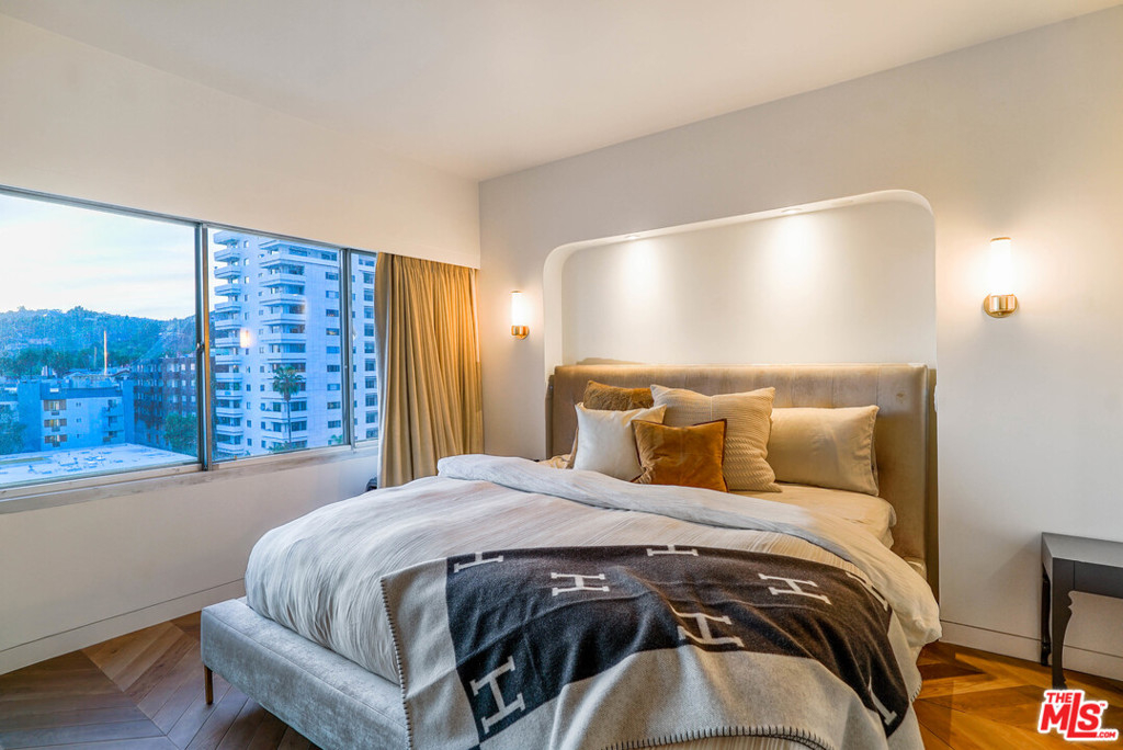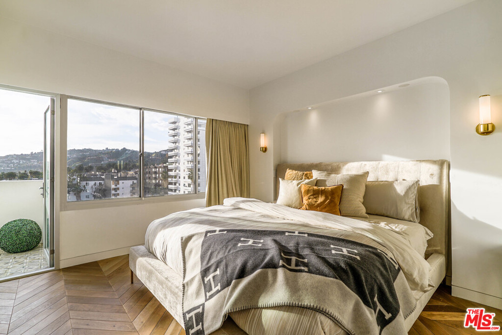 An open floor plan, clean lines, exceptional built-ins for storage seamlessly flows throughout this Mid-Century Modern design. A wall of glass across the living and dining areas glides open to allow you to enjoy 180-degree views of the city and the Hollywood Hills. The kitchen features a dramatic marble book-matched mural backsplash, elegant bar seating on the beautiful stone countertop, and state-of-the-art Miele appliances. The bright and spacious master suite has access to the balcony and includes a custom walk-in closet and a decadent master bath with exquisite marble walls and Ann Saks tile floors. Seamlessly open pocket doors that completely merge the living area to the second bedroom for additional space to entertain with by day and a built-in Murphy bed by night. The second bath boasts artfully designed Akdo tiled walls, mirrored ceiling, marble art deco vanity, and Kallista brass faucet and shower accents. Situated in a full-service building equipped with a pool, gym, valet, and a doorman, this unit combines artful living with all the amenities of city life.