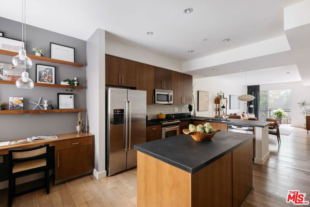 Nestled within a densely landscaped enclave in the heart of Hollywood, this private 2 bedroom 2 bath unit offers relaxing urban living with sophistication. Upon entering from the courtyard garden, you will feel a sense of calm and serenity, surrounded by bamboo and natural hues. Past the entryway a den greets you with built-in dual desks and walnut shelving. The premium finishes begin here and continue throughout the residence. These elements are an extension of the building's metal, wood, & glass facade blending both spaces together with wide plank American Oak flooring, natural stones, marble, soaring 9 foot ceilings and voluminous windows. Flanked by the dining room, the kitchen sports chef-grade appliances and wood cabinetry accented with Makoto tiling and black stone countertops. A generous sized island and bar overlook the spacious lounging and eating areas which open seamlessly to the covered terrace and greenbelt. The tranquilizing primary suite features lighting by Jonathan Adler and custom wall coverings. Zen out in the massive walk-in rain shower and soaking tub, both areas make the spa worthy bathroom the ultimate self-care space. This suite is completed with a large walk-in closet with wood shelving and drawers and separate storage closet. Off the hallway, you will discover a full-size guest bathroom with marble counters, laundry closet with stacked Bosch washer/dryer, and two storage closets. The guest bedroom is located on south side of the unit and has ample closet/storage space. Built in 2009, Metropol's distinctive design makes it one of the most sought-after developments in Hollywood with RARE availability. Community amenities include a fitness center, sun deck, 20 guest parking spots, individual EV chargers, as well as two parking spots that are reserved for the unit. Low HOA dues! Located close to restaurants and the metro. Just moments from Netflix and the 101.