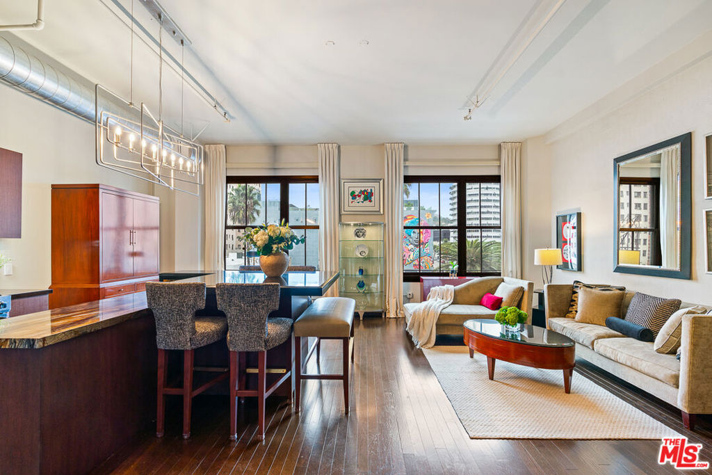 Receive huge property tax savings with The Broadway's MILLS ACT STATUS! Experience the grandeur and elegance of the Golden Age of Hollywood in the fabulous Broadway Hollywood Lofts, situated at the iconic cross-section of Hollywood and Vine. More than a residence, The Broadway offers a lifestyle; from the spectacular, newly upgraded rooftop pool with private cabanas, fire pit, and 360-degree views of all of Los Angeles (including the Hollywood sign, the Capitol Records Building, the Griffith Observatory, and the Hollywood Hills); to the glamorous lobby, whose luxurious ambiance and immaculate retention of 1920s Art Deco details make you feel as though you have gone back in time. A fully equipped state-of-the-art gym, valet parking, and the security of a 24-hour doorman, make The Broadway the pinnacle of Los Angeles living, all within one city block's distance of The Pantages Theatre, Amoeba Music, The Aster Hotel, Equinox, Trader Joe's, and the Hollywood/Vine Metro Station. Unit 407 looks directly onto the Capitol Records Building, the Hollywood sign, and the beautiful Hollywood Hills that rise above the city. The design of the unit perfectly pairs modern industrial style and refined old-world elegance. The stately open floor plan with soaring ceilings feels airy and spacious, with espresso hardwood floors, oversized dual-paned windows adorned with blackout shades, and a stylish kitchen featuring stainless steel appliances and a custom island that seats six. The newly renovated bathroom with elegant Art Deco finishes adds just the right luxurious tone to the space. Custom cabinets and finished closets offer a generous amount of storage. An in-unit washer/dryer finishes out this perfect abode. Seize this opportunity to own a slice of history and experience the allure of the fabulous Broadway Hollywood!
