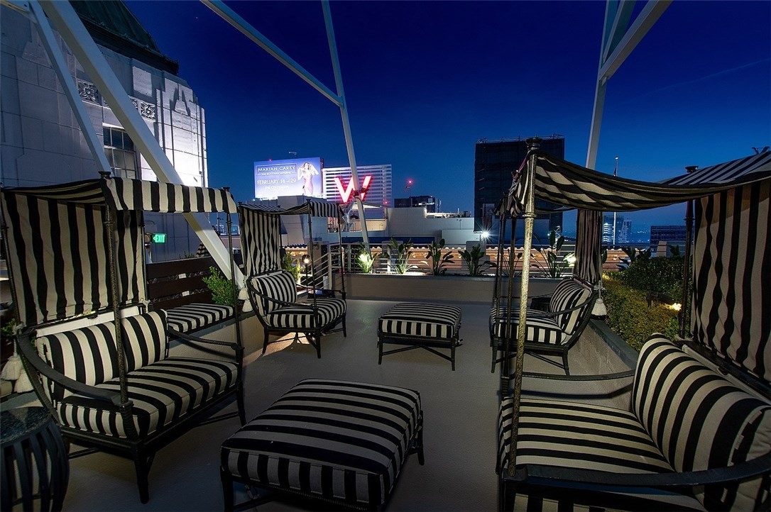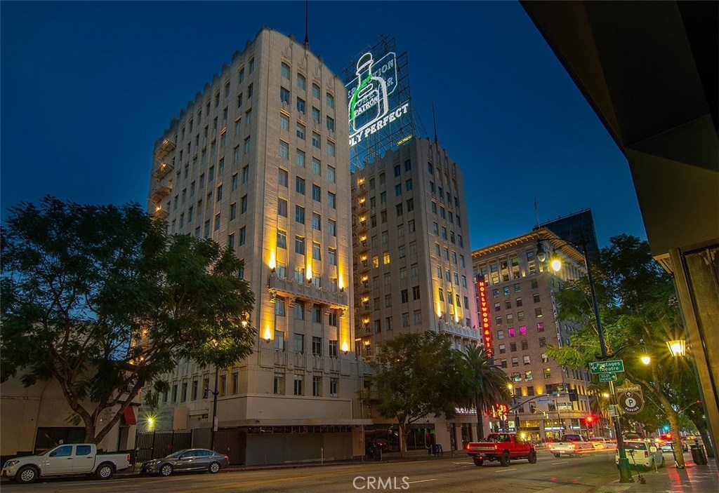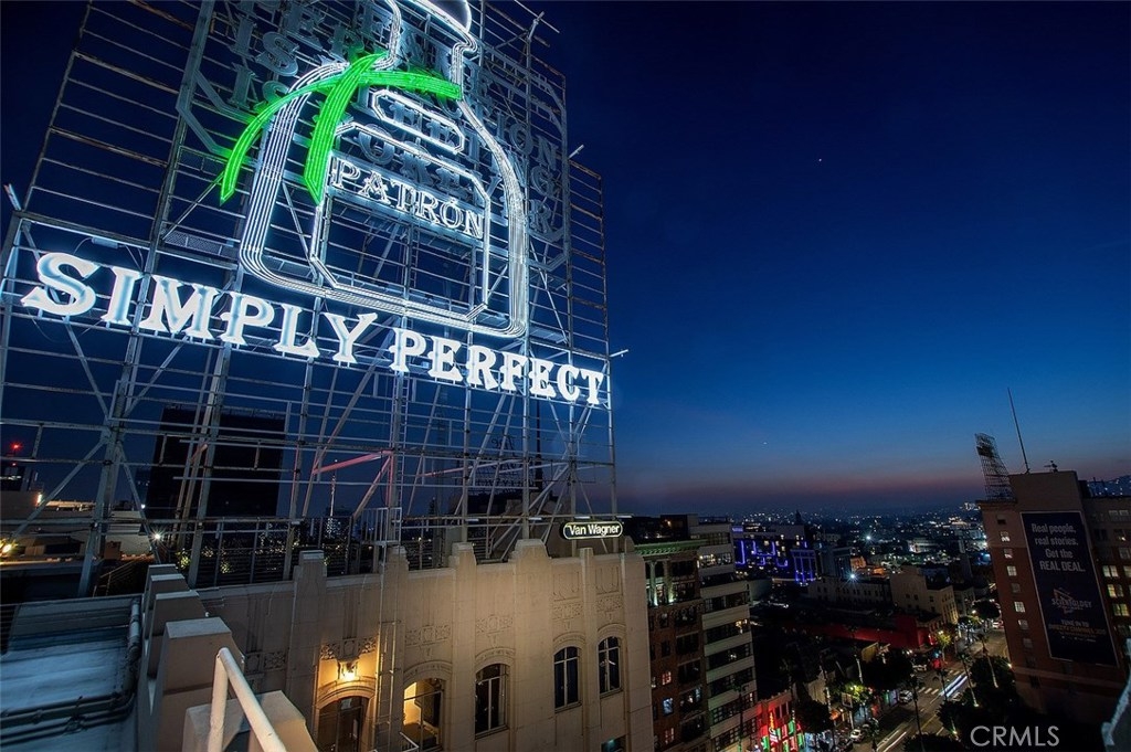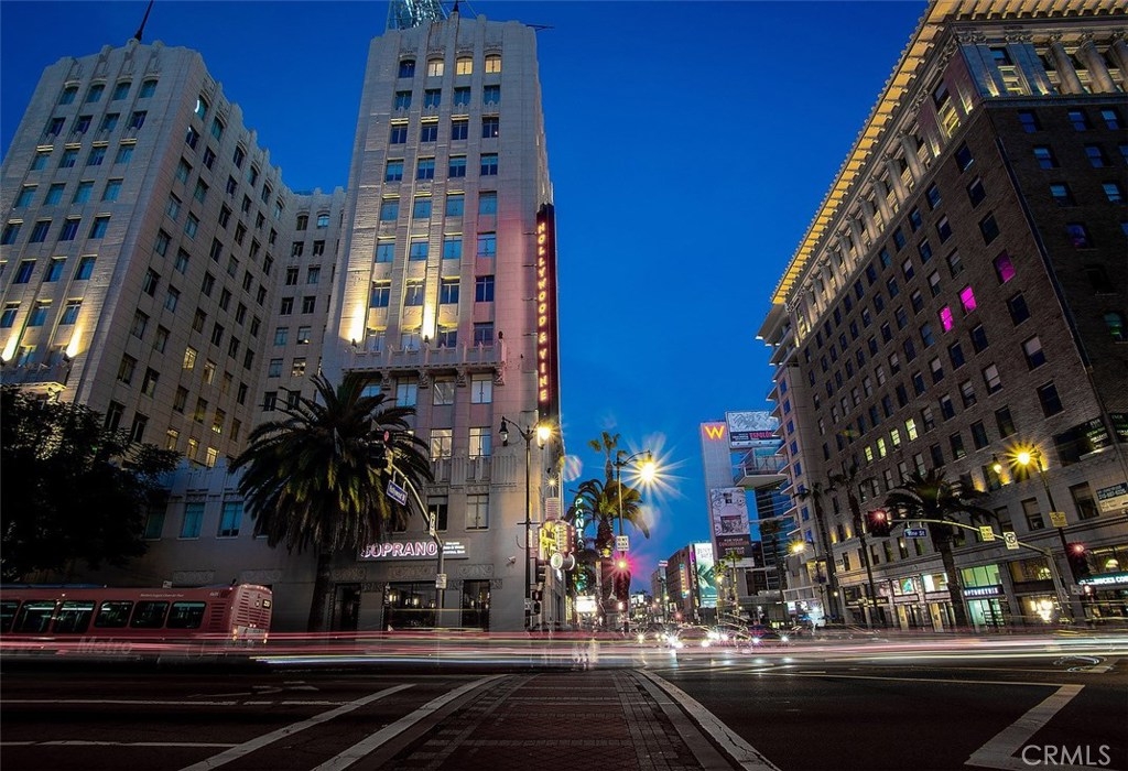 The Lofts at Hollywood and Vine! This loft is situated at the front of the building facing Hollywood Boulevard, an end unit with only one shared wall. The natural sunlight spills in through the tall windows into the bedroom and living areas making this home light and bright. The stainless-steel appliances complement the modern design of the kitchen along with the concrete floors and exposed concrete walls. The living area is complete with a faux fireplace, projector and screen; the ultimate in entertaining spaces. The bedroom has corner windows allowing for those evening views of the city lights and an attached private bathroom. There are laundry hook ups in the hall closet and a guest bath with shower/tub combination. The sensational views from this unit include the Hollywood sign, Capitol Records building, The W Hotel and beautiful Pantages Theatre sign. The roof top patio is perfect for entertaining or just relaxing on the lounge chairs, listening to the water feature and enjoy the city lights. The Metro station is across the street at the W and Trader Joe’s around the corner. Valet parking, the 24 hour doorman and Hollywood entertainment complete this to be one of the most desired locations in Hollywood.