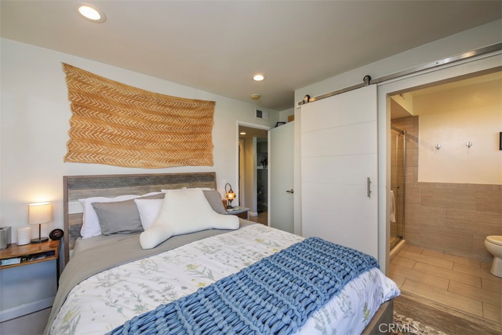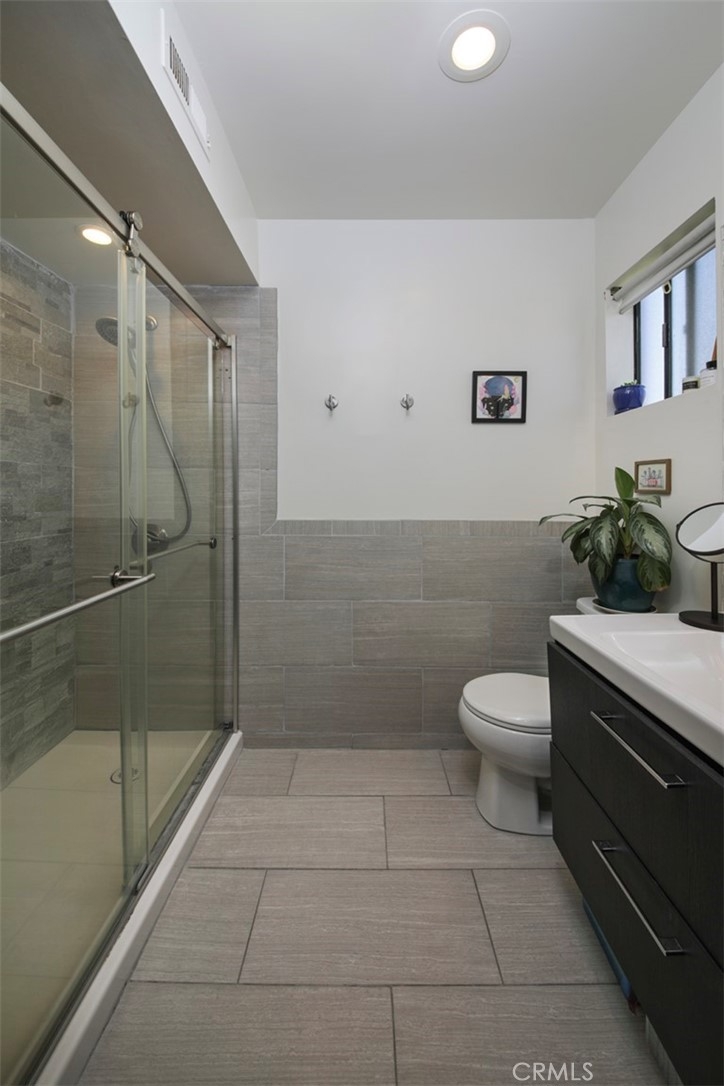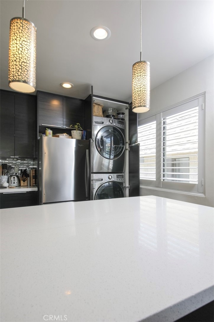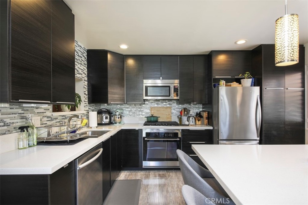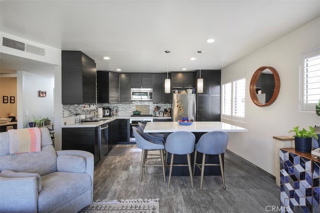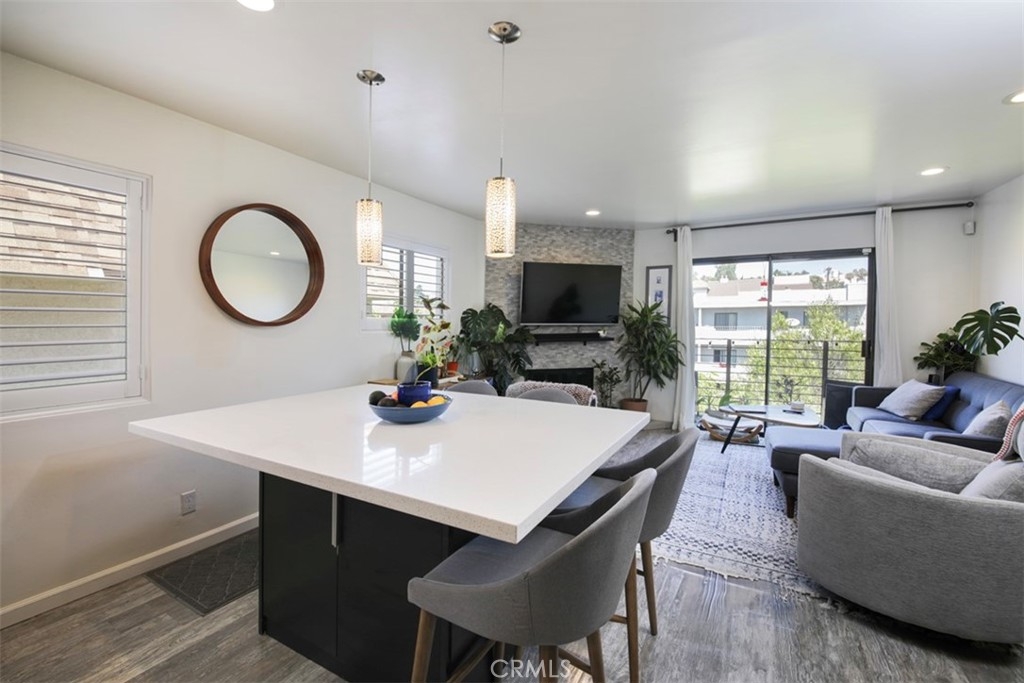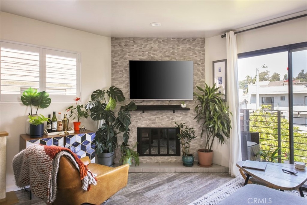 Stunning, recently redone 2 bed 2 bath chic & contemporary condo! Front facing, top floor corner unit with just one common wall has optimal tree-lined street views and maximum privacy. Open concept gourmet kitchen with custom oversized island, quartz countertops, custom cabinetry and stainless steel appliances beckons you to host your next dinner party. The inviting living area opens out to one of two balconies with garden views and warm natural light, and features plantation shutters, fireplace with gorgeous glass crystals and streamlined marble tile. En suite primary bedroom has its own balcony. Second bedroom has ample space and can also serve as an office and/or exercise room. Both bathroom retreats were completely redone recently with designer finishes and impeccable attention to detail, including a stylish barn door and soaking tub for relaxation. Features include recessed LED lighting throughout, central A/C and heat with Nest thermostat, 5 year new electrical panel, in-unit full size washer and dryer, ADT alarm system, and gated subteranean parking with two SIDE-by-SIDE spaces. Quiet, friendly 12-unit building with newly installed roof (energy-efficient Cool Roof System) plus brand new piping throughout. Nestled on a tree-lined Westside block, conveniently close to shops, restaurants, Westwood, Century City & trendy Downtown Culver City. Commuting is a breeze with easy access to 405 & 10 freeways and Palms/Culver City Expo line.