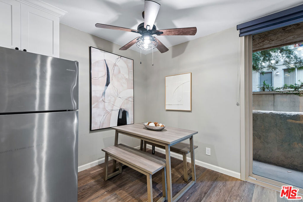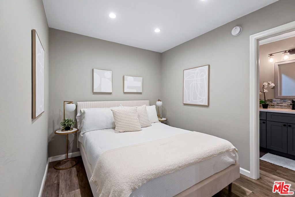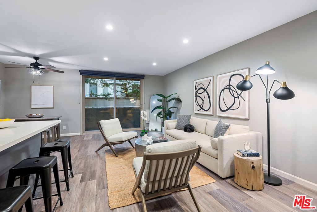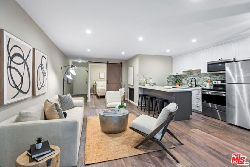 Beautifully remodeled and thoughtfully designed, this stylish Brentwood condo offers modern comfort with refined finishes throughout. The open layout maximizes nearly 600 square feet of usable living space, enhanced by wide-plank laminate flooring, contemporary recessed lighting, and a striking wood barn-style sliding door that separates the bedroom area while maintaining a seamless flow. The updated kitchen features soft-close cabinetry, quartz countertops, stainless steel appliances, a farmhouse sink, mosaic backsplash, under-cabinet lighting, and a center island. The living area includes a fireplace that serves both the living and bedroom spaces, while sliding glass doors with designer blinds open to a private balcony. Additional highlights include an ensuite bathroom with a separate vanity area, a walk-in closet, and modern fixtures throughout. Ideally positioned at the rear of the building, the unit offers a quiet, private setting with convenient access to the rear elevator. The secure community offers desirable amenities including a pool, spa, sauna, on-site laundry, and lobby security most evenings. Ideally located near Montana Ave and San Vicente Blvd, with close proximity to neighborhood favorites such as Whole Foods Market, Great White, Baltaire, La La Land, Alfred Coffee, and a wide array of dining and shopping options. A turnkey opportunity in one of Brentwood's most desirable locations.