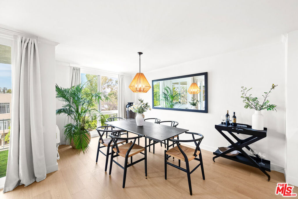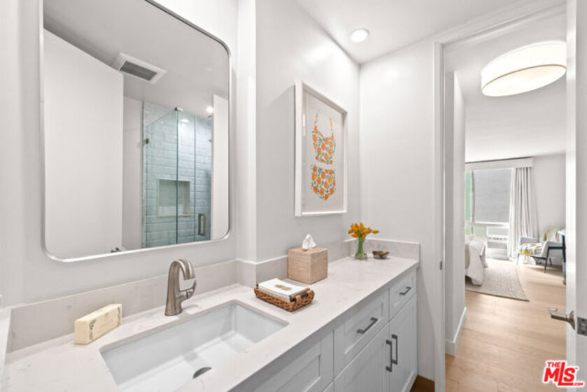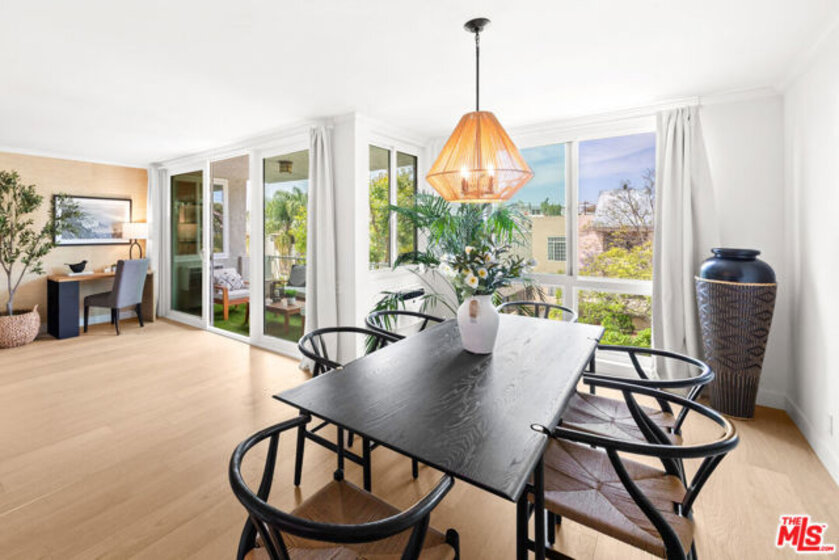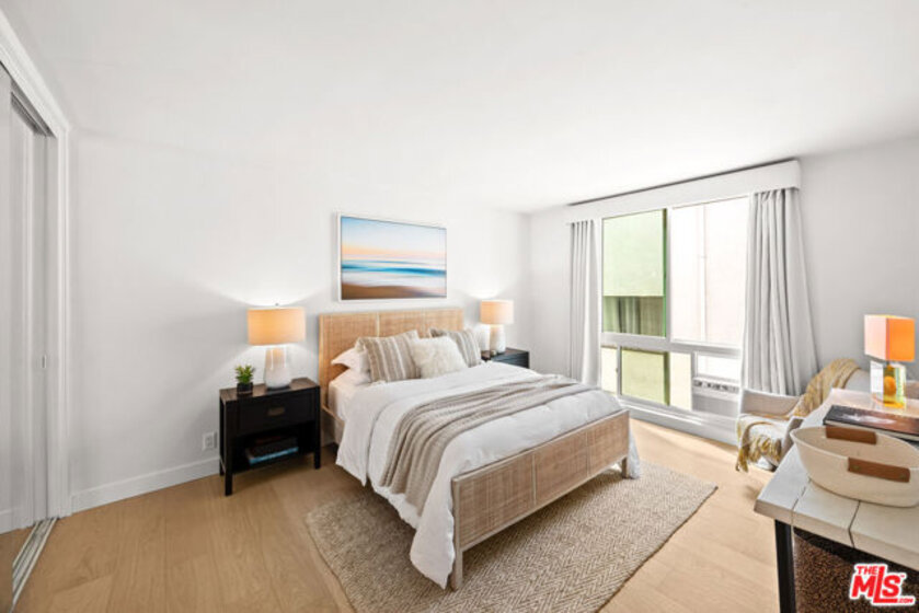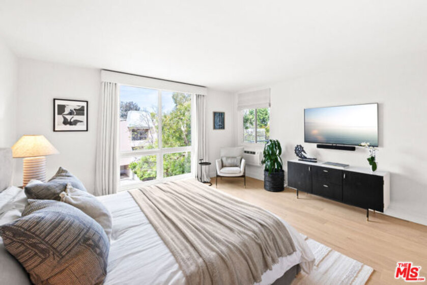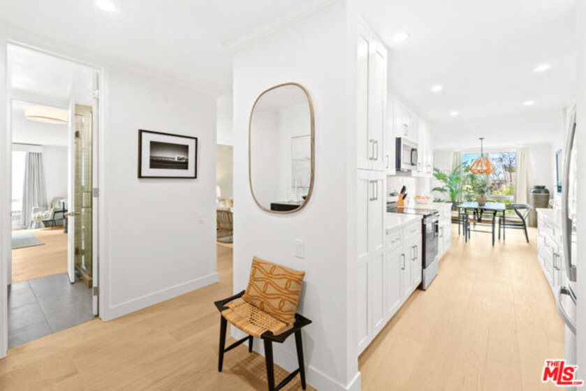 Welcome to 11918 Kiowa #201, a beautifully updated, front-facing residence offering refined luxury and effortless sophistication in the heart of Brentwood. Surrounded by tranquil, tree-lined vistas and blooming jacarandas, this elegant 2-bedroom, 2-bath condominium blends serenity with vibrant city living. Bathed in natural light, the open-concept floor plan is framed by floor-to-ceiling double-pane windows and enhanced by newly installed wood flooring, creating a seamless indoor-outdoor experience. The spacious living area opens to an oversized private balcony, offering a peaceful outdoor setting ideal for morning coffee, unwinding in the evening, or enjoying quiet moments throughout the day. The designer kitchen features custom white cabinetry, pull-out storage, quartz countertops, custom lighting, and new stainless-steel appliances, flowing into a generous dining area ideal for both intimate dinners and effortless entertaining. The primary suite offers a calming, elevated ambiance with views of surrounding treetops and overlooks the inviting private balcony, complemented by a walk-in closet and a spa-inspired bath with soaking tub and shower. The secondary bedroom is thoughtfully positioned for privacy and features generous closet space, along with a beautifully updated en-suite bathroom with refined finishes, creating a welcoming retreat for guests or a sophisticated home office. Additional features include in-unit laundry, a formal double-door entry, two side-by-side parking spaces, and abundant storage. Residents enjoy a well-maintained building with controlled access, elevator service, a renovated lobby and recreation room, secure garage parking, lush landscaping, and earthquake insurance. Perfectly situated with a Walk Score of 88, just moments from Brentwood's premier dining, boutiques, and everyday conveniences along Wilshire and San Vicente, this home offers an exceptional blend of comfort, style, and location.