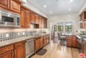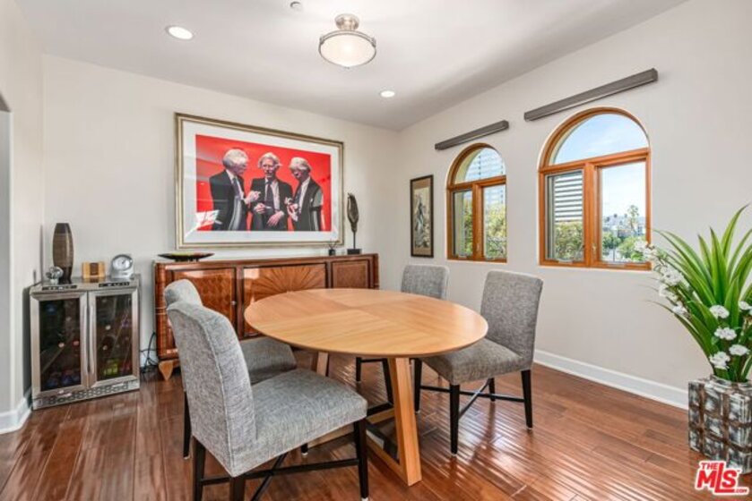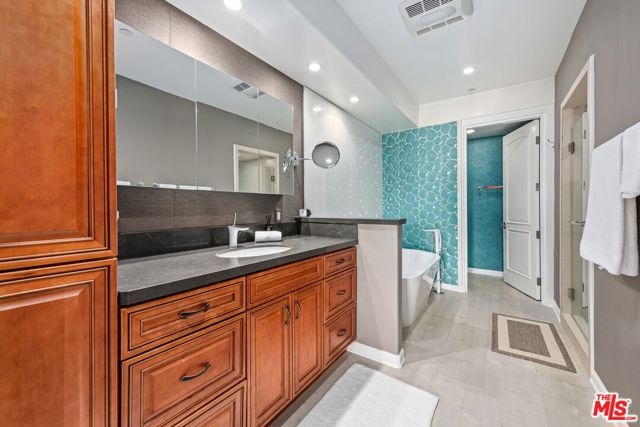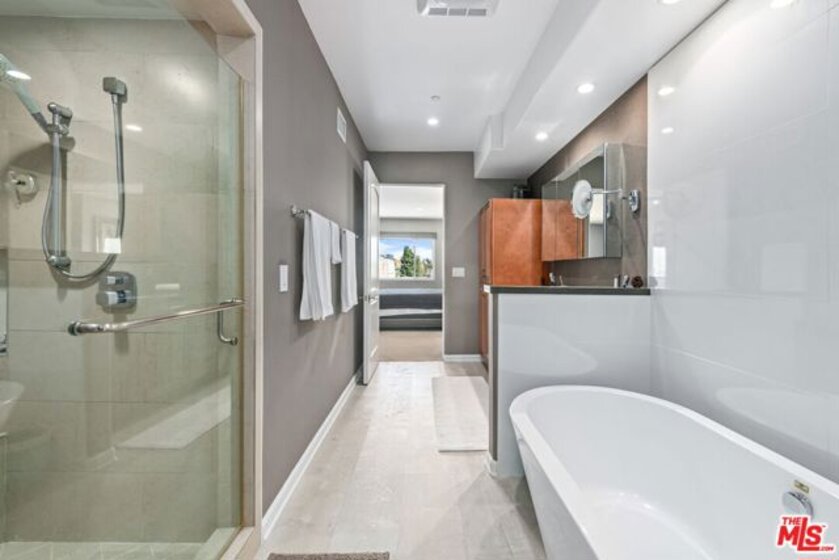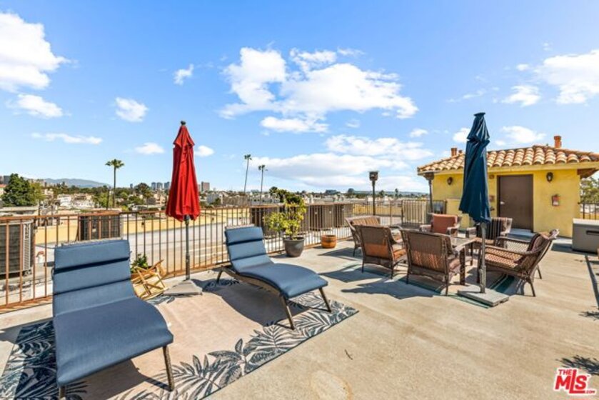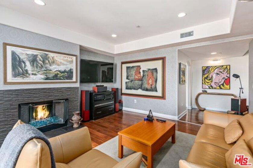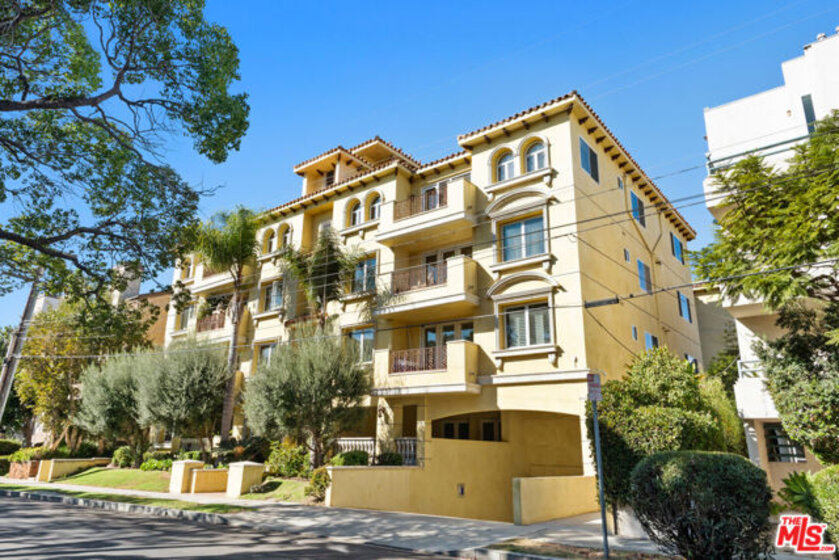 This exquisitely remodeled corner penthouse in a newer Mediterranean style building offers an unparalleled blend of refined elegance, comfort and sophistication, as well as gorgeous northeast facing views of city and skyline. This "developer's unit" boasts 3 bedrooms or 2 plus a den and 2.5 baths in approximately 1850 square feet all on one level. A gracious double door entry and expansive Anderson windows welcome you into an open and airy living space where high ceilings and rich wood floors create a peaceful, inviting ambience. A chic "designer perfect" powder room is tucked off the entry. Designed with both style and function in mind, the gourmet kitchen features top of the line Viking appliances and a Sub-zero fridge, Caesarstone countertops and custom cabinetry. The living and dining areas, enhanced by a custom designed stone fireplacethat adds warmth and character flow to a large front balcony. The serene primary suite offers a fireplace, luxe bath and generously sized walk-in closet. A spa like guest suite completes this wing of the unit. A spacious private rooftop deck with BBQ area offers breathtaking views, providing the perfect backdrop for entertaining or quiet relaxation. No expense was spared on the quality updates and finishes throughout which include imported wall coverings and Porcelanosa Spanish tile. Other highlights include recessed lighting, ample storage inside and out, secured side by side parking, plus guest parking, and low HOA dues. Ideally situated adjacent to Brentwood, Santa Monica and Westwood, this rare and special residence is truly a gem!