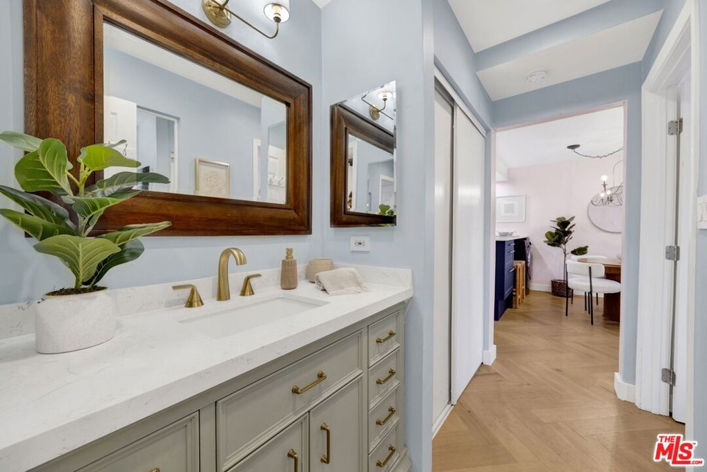 Welcome to this beautifully remodeled 1-bedroom, 1-bathroom condo offering a stylish blend of modern updates and functional design. The open layout is filled with natural light and features herringbone natural-hardwood floors, a convenient study nook, and recessed lighting. The updated kitchen is complete with newer cabinets, stainless steel appliances (refrigerator, dishwasher, microwave, and electric stove), and a reverse osmosis water filtration system. The bathroom showcases Neo-Moorish tile, a modern vanity, and a TOTO toilet with bidet attachments. Additional upgrades include in-unit laundry, new A/C split systems, a designer ceiling fan, and a coffered ceiling in the bedroom. A private balcony provides an outdoor extension of the living space. Located in the heart of Hollywood, with a partial view of the iconic Hollywood Sign landmark, this residence offers walkable proximity to dining, entertainment, and shopping.
