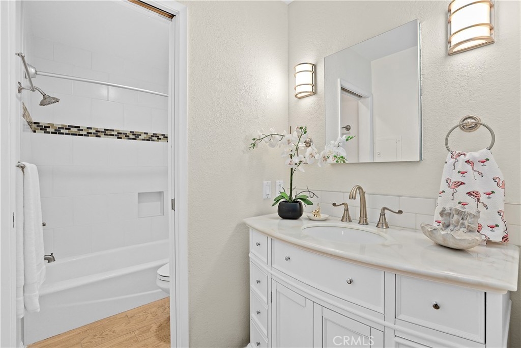 This top-level updated one bedroom and one bathroom with a private balcony is located at the gated complex in the heart of Hollywood. The bright living room has sliding doors to the private balcony to enjoy west views of the Hollywood Hills. The dining area is open to the kitchen offers wall to wall closet. Remolded open kitchen highlighted by quartz countertop and newer cabinets. One bedroom offers a spacious walk-in closet. Updated bathroom provides newer vanity tiles in the shower wall. Laminated flooring throughout. One security gated assigned parking space. The unit is easy access to the elevator to the garage, community laundry room and fitness center. HOA dues include water, trash and, surveillance camera and exterior maintenance. Grate location is adjacent to West Hollywood, a block off Sunset Boulevard; minutes away from Roosevelt Hotel, Kodak Theater, Chinese Theater, Runyon Canyon hiking trail, Studios, night clubs, boutiques, best restaurants & coffee houses!