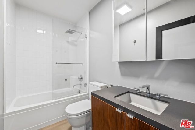 This 1,240 sq.ft. front unit at Gramercy Row in Hancock Park offers privacy, natural light, and thoughtful modern design by AIA-awarded firm Assembledge+. The layout includes an open ground floor with high ceilings, polished concrete floors, smart blinds, smoked glass details, living and dining areas, kitchen with Caesarstone counters and backsplash, LED lighting, updated stainless steel appliances, and a powder room. The second level features bamboo floors, a flexible-use room, full bath, in-unit LG washer/dryer, and storage. The top-floor primary suite includes more bamboo floors, a custom closet, smart blinds, and a skylit bathroom with double sinks, floating vanity, under-cabinet lighting, and a smoked glass divider. A spiral staircase leads to a private rooftop deck with unobstructed 360-degree views from Downtown to the Hollywood Sign. Additional features include a Nest thermostat, Hue smart lighting, Nest smoke detectors, and frosted glass for added privacy. Two tandem parking spaces, guest parking, and elevator access complete the offering. Located near Larchmont Village with easy access to Hollywood and Downtown.