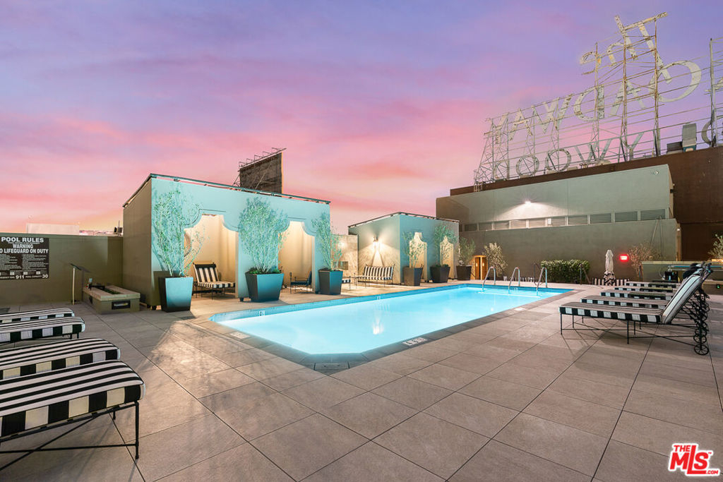Receive huge property tax savings with The Broadway's MILLS ACT STATUS! Experience the grandeur and elegance of the Golden Age of Hollywood in the fabulous Broadway Hollywood Lofts, situated at the iconic cross-section of Hollywood and Vine. More than a residence, The Broadway offers a lifestyle; from the spectacular, newly upgraded rooftop pool with private cabanas, fire pit, and 360-degree views of all of Los Angeles (including the Hollywood sign, the Capitol Records Building, the Griffith Observatory, and the Hollywood Hills); to the glamorous lobby, whose luxurious ambiance and immaculate retention of 1920s Art Deco details make you feel as though you have gone back in time. A fully equipped state-of-the-art gym, valet parking, and the security of a 24-hour doorman, make The Broadway the pinnacle of Los Angeles living, all within one city block's distance of The Pantages Theatre, Amoeba Music, The Aster Hotel, Equinox, Trader Joe's, and the Hollywood/Vine Metro Station. Unit 407 looks directly onto the Capitol Records Building, the Hollywood sign, and the beautiful Hollywood Hills that rise above the city. The design of the unit perfectly pairs modern industrial style and refined old-world elegance. The stately open floor plan with soaring ceilings feels airy and spacious, with espresso hardwood floors, oversized dual-paned windows adorned with blackout shades, and a stylish kitchen featuring stainless steel appliances and a custom island that seats six. The newly renovated bathroom with elegant Art Deco finishes adds just the right luxurious tone to the space. Custom cabinets and finished closets offer a generous amount of storage. An in-unit washer/dryer finishes out this perfect abode. Seize this opportunity to own a slice of history and experience the allure of the fabulous Broadway Hollywood!