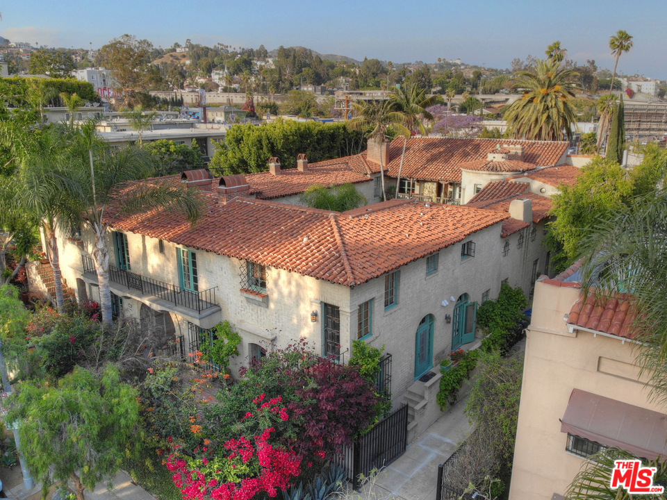 This gorgeous historic two-story Spanish-style townhouse is located in one of the six remaining Spanish revival courtyard buildings. The "El Cabrillo" was designed in the 1920's by Arthur & Nina Zwebell, and commissioned by Cecil B. Demille. Living room has soaring 20 ft ceilings and large engraved stone fireplace, formal dining room, kitchen and private back patio. Kitchen has granite counters, stainless steel Bosch appliances. Central a/c and heat, washer/dryer inside the unit. Walking distance to the Hollywood Bowl, W Hotel Hollywood, Trader Joe's and several theaters, restaurants, clubs and more. On the National Historical Register and is preserved under the Mills Act, which allows significant tax benefits to the owner. One-car garage parking. Seller selects services.
