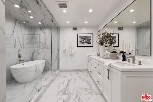 Welcome to 2338 Century Hill, an exquisitely reimagined split-level residence offering the perfect blend of modern luxury, architectural sophistication, and indoor-outdoor living in the heart of Century City. This newly remodeled home showcases impeccable craftsmanship, curated design, and one of the most desirable floor plans in the community, complete with a rare oversized private terrace ideal for al fresco dining and open-air entertaining. A gracious formal entry sets the tone, unfolding into a dramatic open-concept layout anchored by an elegant staircase that serves as a striking design. The main level flows effortlessly from the dining area into a sophisticated yet comfortable living space, framed by clean architectural lines, designer lighting, and seamless access to the expansive terrace through its verdant view patio doors. The fully renovated kitchen is outfitted with top-of-the-line appliances, custom cabinetry, stone countertops, and a sunlit breakfast area that invites effortless everyday living. Upstairs, the tranquil primary suite offers a large balcony, generous walk-in closet, and a spa-like bath featuring a free standing soaking tub, and oversized glass-enclosed shower. A well-appointed guest suite with its own stylish bath and ample storage completes the upper level. Additional highlights include wide-plank hardwood floors, new systems, smart-home features, in-unit laundry, wine refrigerator, 2 side by side parking spaces w one EV Charger Station + a 3rd additional parking space and huge private storage room included. Situated within the prestigious 24-acre, guard-gated enclave of Century Hill, residents enjoy world-class amenities including multiple pools, tennis courts, a state-of-the-art fitness center, clubhouse, and beautifully manicured grounds all just moments from Beverly Hills, Westfield Century City, and the finest dining, shopping, and entertainment on the Westside. Stylish, secure, and turnkey, 2338 Century Hill delivers elevated living in one of the city's most coveted addresses.