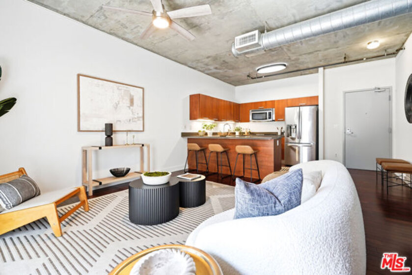 South Park 1B/1B soft loft stunner. This light, open, & bright east facing loft home has it all - high ceilings, 2 large private balconies overlooking courtyard palm trees and pool. Award winning interior design, exposed ducts & pipes, hardwood floors, sleek Italian cabinetry, Caeserstone countertops, stainless steel appliances, and in unit washer/dryer. Extra large walk in closet. 1 Assigned parking space in attached secured garage. Amenities include pool, gym, screening room, private party room, BBQ area, 24 hour front desk security, in-building covered parking, and Amazon Locker for your deliveries. Walking distance to LA Live, FDIM, theaters, fine dining, upscale entertainment, Financial and Fashion Districts. Conveniently located above Ralph's supermarket and just around the corner from Whole Foods. Walking score of 96. HOA dues cover parking, water, trash, & gas. Residents pay for their own electricity + internet separately. Come live at Market Lofts and experience the burgeoning community of art, culture, and entertainment in downtown.