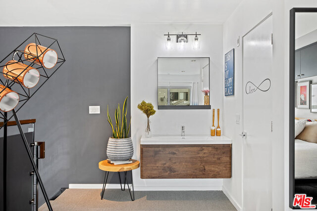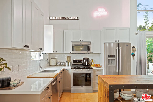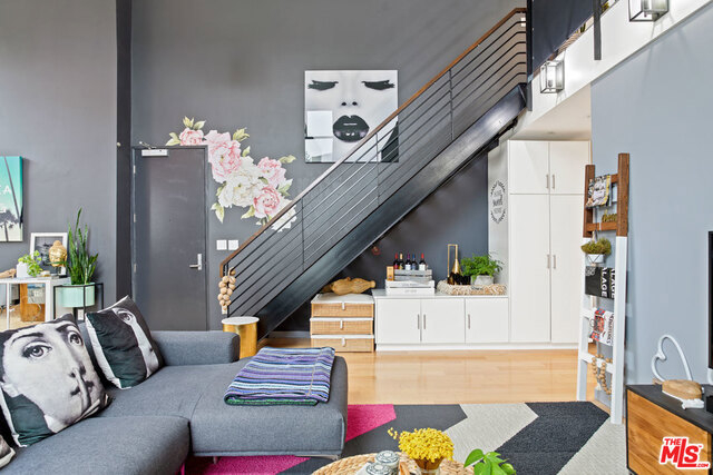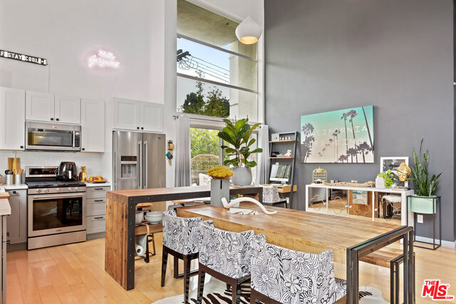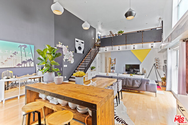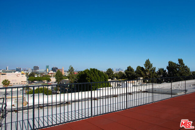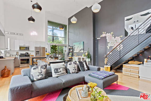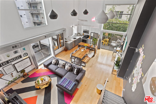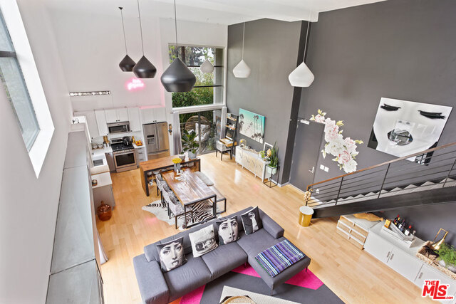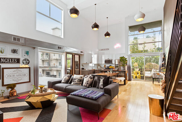 Abundant natural light and dramatic 18' ceilings are among the impressive features in this stunning, loft-like home in a great Hollywood location. The newly renovated "end-unit" condominium has a spacious two-level floor plan centered around the great room, with easy flow to a private balcony. Impressive design details include oversized windows, sliding glass doors, wood flooring and stylish modern fixtures. The open kitchen is outfitted with quartz countertops, a full-height tile backsplash and stainless appliances. There are two bedrooms and two beautifully updated baths. On the community rooftop deck you'll relax and entertain against a magnificent panorama of sunsets, city lights and the iconic Hollywood Sign. Amenities include central heat+air, two deeded parking spaces and ample guest parking. This intimate HOA is around the corner from the landmark Roosevelt Hotel, convenient to restaurants, theaters, nightlife and more. Paramount and Raleigh Studios are within easy reach.
