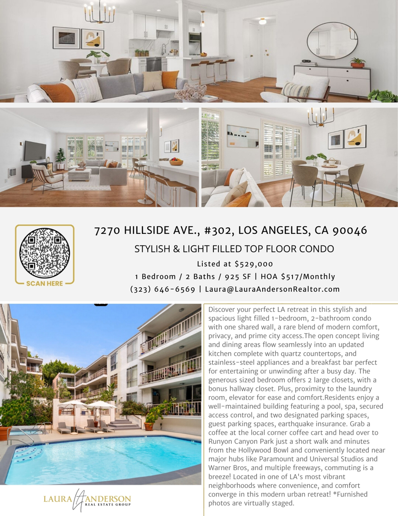 Great opporunity to own this stylish and spacious light filled 1-bedroom, 2-bathroom condo with one shared wall, a rare blend of modern comfort, privacy, and prime city access.The open concept living and dining areas flow seamlessly into an updated kitchen complete with quartz countertops, and stainless-steel appliances and a breakfast bar perfect for entertaining or unwinding after a busy day. The generous sized bedroom offers 2 large closets, with a bonus hallway closet. Plus, close proximity to the laundry room, elevator for ease and comfort.Residents enjoy a well-maintained building featuring a pool, spa, secured access control, and two designated parking spaces, guest parking spaces, earthquake insurance. Grab a coffee at the local corner coffee cart and head over to Runyon Canyon Park just a short walk and minutes from the Hollywood Bowl and conveniently located near major hubs like Paramount and Universal Studios and Warner Bros, and multiple freeways, commuting is a breeze! Located in one of LA's most vibrant neighborhoods where convenience, and comfort converge in this modern urban retreat! *Furnished photos are virtually staged. When visting the open houses please park in the 9 guest parking spaces behind the building ( enter thru the alley).