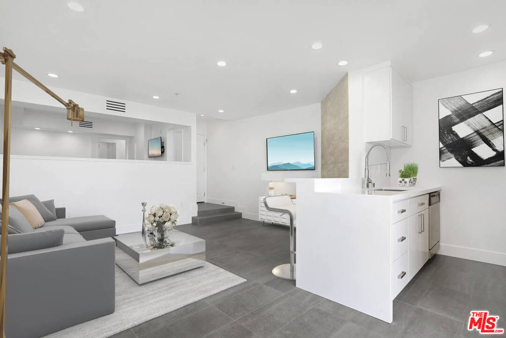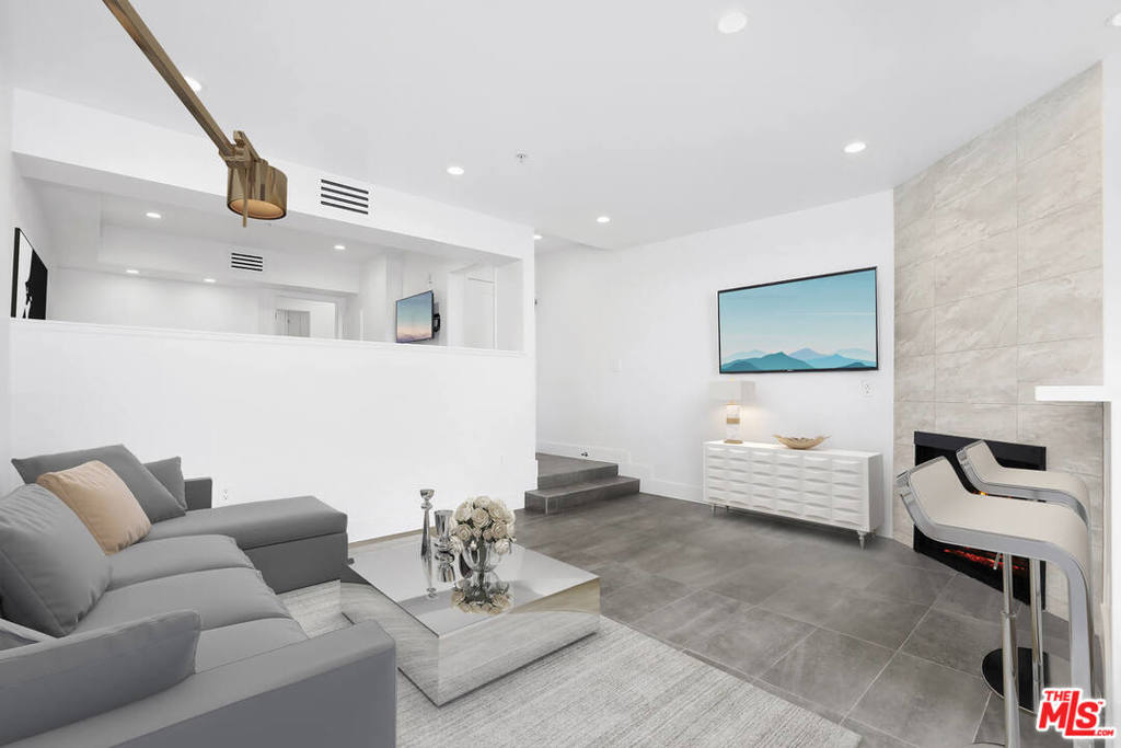 Striking modern top-floor unit with brand-new high-quality finishes. Italian porcelain tile floors and crisp white walls paired with recessed lighting present a welcoming ambiance you'll want to linger in. A large living room opens to the kitchen and dining area which features a dazzling fireplace on a tiled wall. In the Kitchen, Quartz countertops and stainless-steel fixtures complement the high-end appliances, while a double-insulated sliding glass door leads to a balcony that overlooks the iconic downtown LA skyline - making it the perfect spot for your morning coffee. This easy-care floor plan offers a private bedroom area plus an elegantly stylish hotel-inspired bathroom that features a glass-enclosed shower, plenty of countertop space, and a bidet toilet. A stackable washer-dryer and a walk-in closet finish off all this jewel in the sky has to offer! Conveniently located in the heart of Hollywood, the building provides a pool & spa, a fitness center & secured parking. HOA includes water, trash and maintenance.