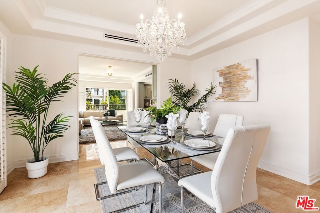Ideally situated in the heart of Brentwood, just moments from the renowned shops, cafes, and restaurants along San Vicente Boulevard, this exceptional first-floor residence offers a rare combination of privacy, convenience, and indoor-outdoor living. Set within an intimate, secure 8-unit building, the home delivers the ease of condominium living with the comfort and feel of a single-family residence. The 2-bedroom, 2.5-bath home is uniquely distinguished as the only unit in the building with multiple private outdoor spaces. A charming side patio with street views, a front balcony, and an additional side outdoor area create an expansive and versatile setting that is ideal for entertaining, relaxing, or enjoying Brentwood's year-round sunshine. Inside, travertine flooring flows through the main living areas and is complemented by recessed lighting and plantation shutters, creating a refined yet welcoming ambiance. The open-concept living and dining areas offer seamless flow for both everyday living and hosting guests. The well-appointed kitchen features a Viking 6-burner range with double oven and stainless steel appliances, including a refrigerator, dishwasher, and microwave. A thoughtfully placed built-in desk area just across from the kitchen provides a convenient workspace for working from home or managing daily tasks. Both bedrooms are generously sized, with the primary suite offering an en-suite bath. The guest bathroom features a steam shower and sleek LED mirror for a spa-like experience, while a separate powder room adds convenience for guests. Additional highlights include in-unit laundry, secure building access, and two assigned side-by-side parking spaces in gated community parking. With its premier Brentwood location, low HOA fees, and rare private outdoor living, this residence presents a unique opportunity to enjoy West Los Angeles living at its finest, where walkability, comfort, and style come together seamlessly.